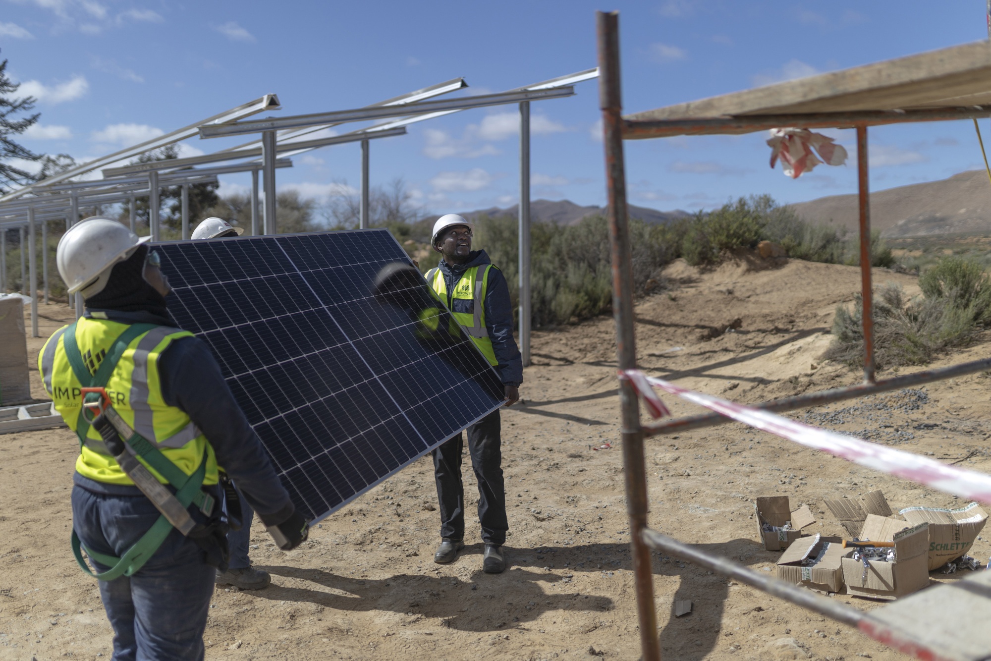 工人在南非Groenfontein的农场安装太阳能电池板。摄影师:Guillem Sartorio/Bloomberg