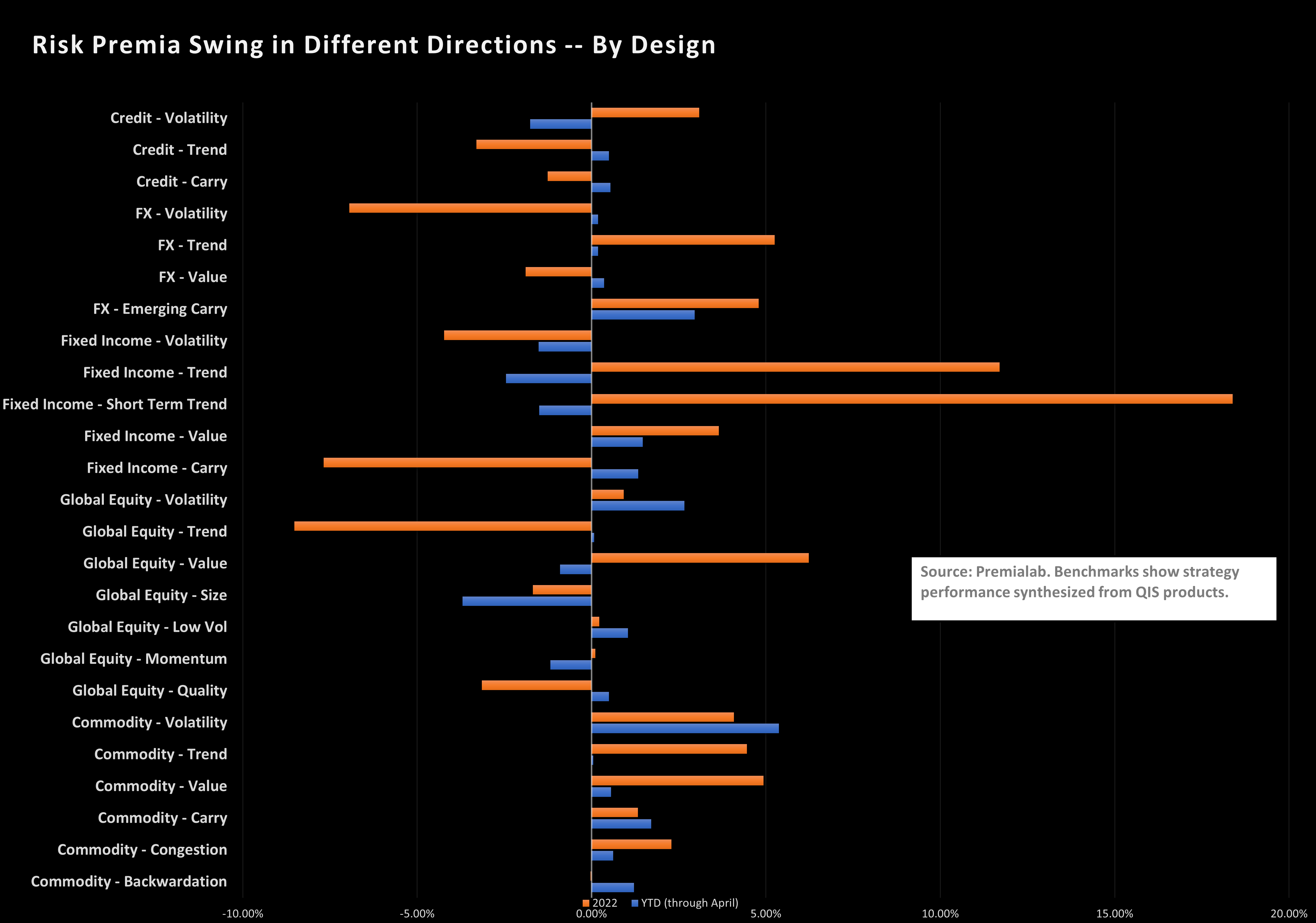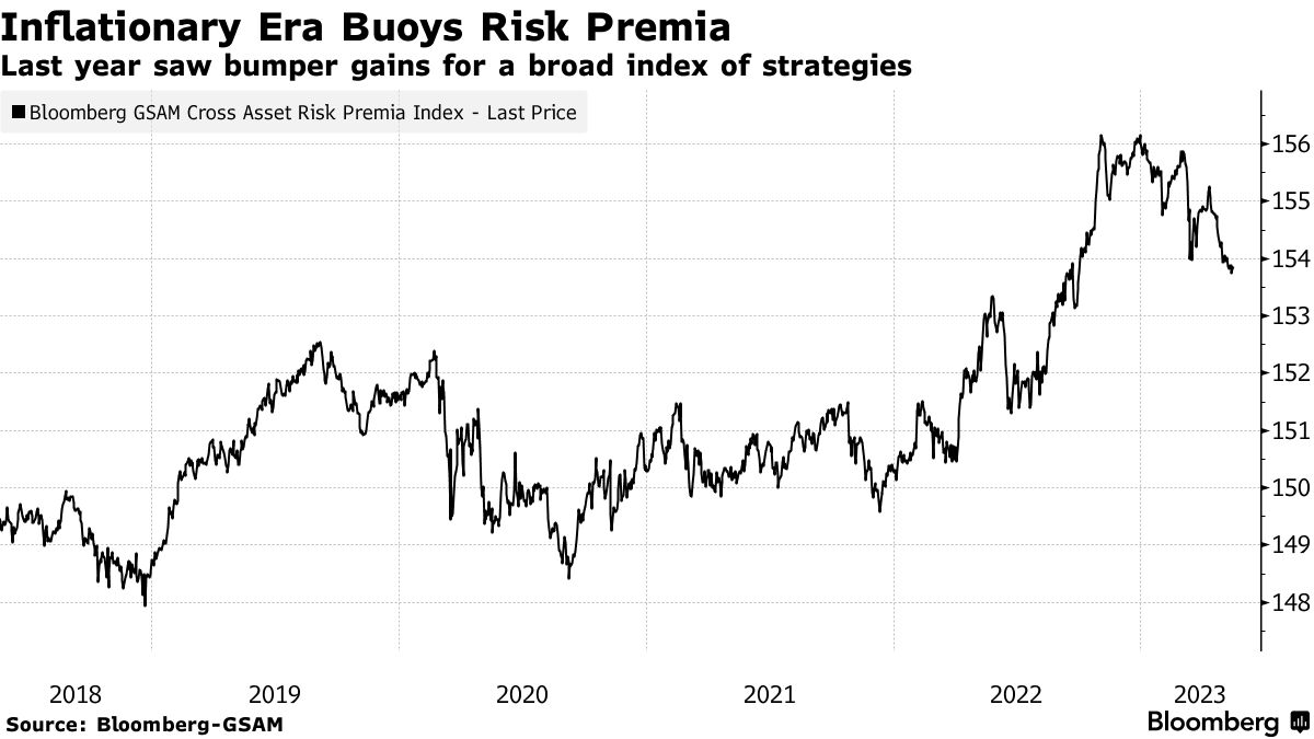 今年的情况更加复杂,投资者的关注重点从通胀担忧转向了衰退和降息的可能性。彭博-GSAM跨资产风险溢价指数-典型风格的综合-到目前为止在2023年下跌了1.5%。Premialab的数据显示,去年一些获利较多的交易,如固定收益中的趋势追踪,出现了大幅逆转,但携带策略的日子更好。