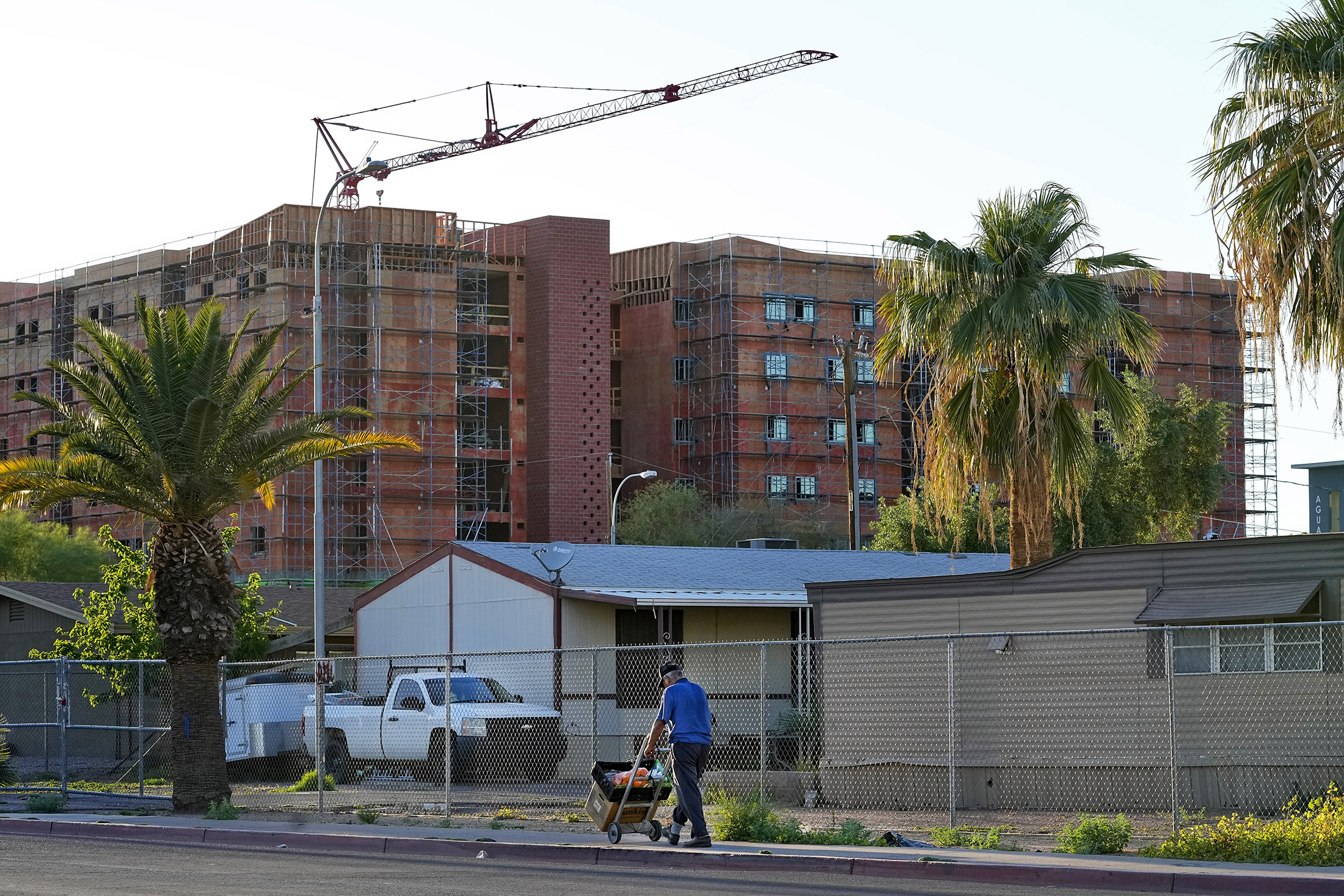 一个卖水果的男人走过了被围栏围起来的凤凰城长春花移动房屋公园,背景是正在建设中的新学生宿舍。