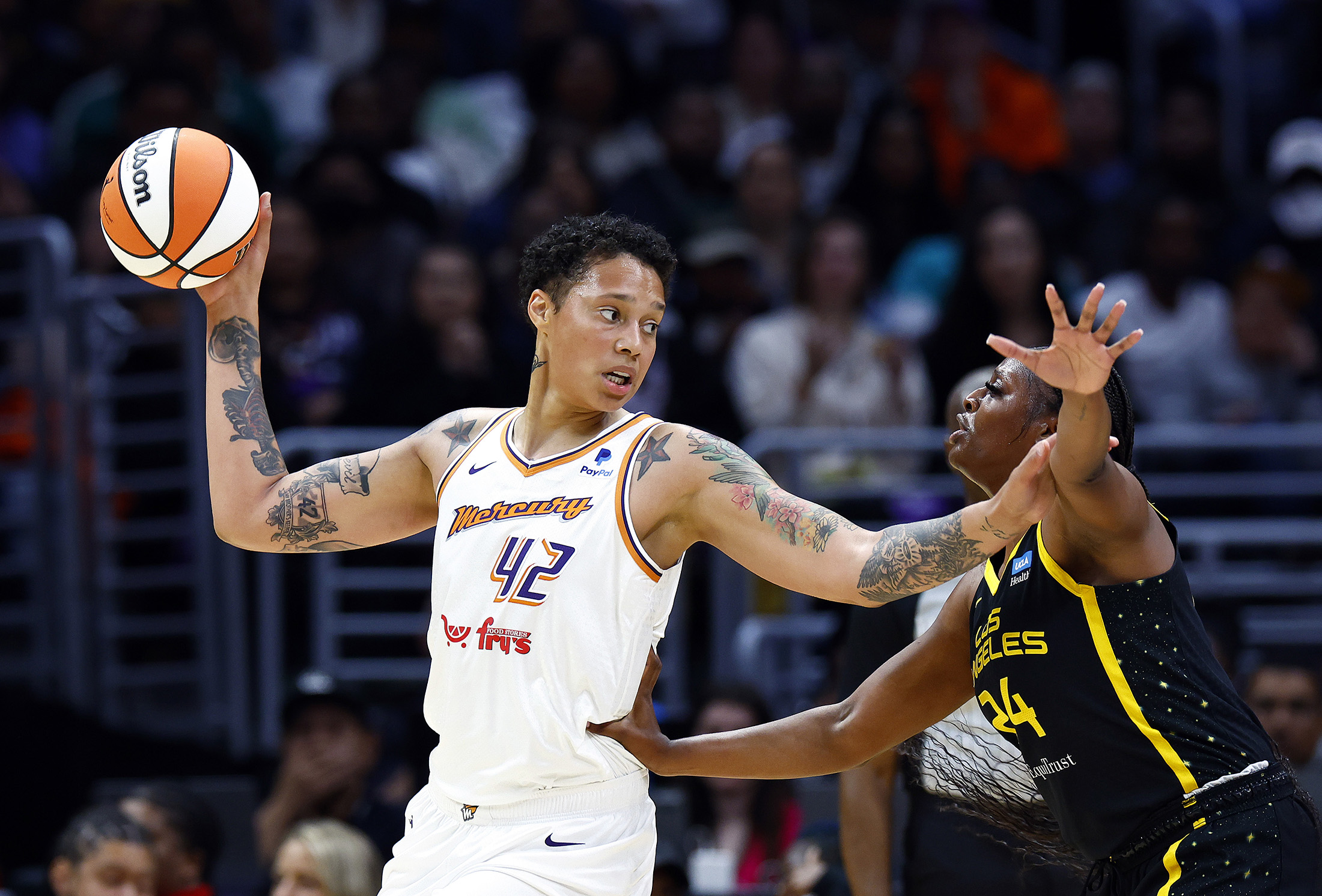 菲尼克斯水星队的布里特尼·格里纳(Brittney Griner)在加利福尼亚洛杉矶的Crypto.com体育馆上半场控球,对阵洛杉矶火花队,比赛于5月19日举行。