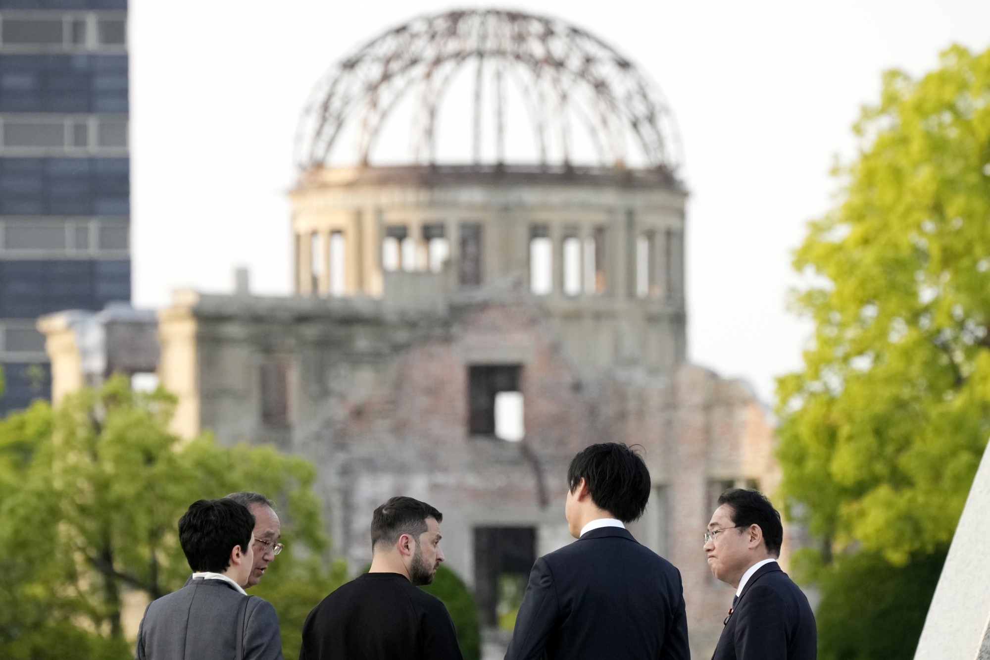 泽连斯基和日本首相岸田文雄在广岛和平纪念公园原子弹圆顶前。摄影师:尤金·星子/AP Photo/Bloomberg两位总统都参加了周日的小组会议,在新闻发布会之前,乌克兰领导人参观了一座纪念1945年核爆炸中死难者的纪念碑。