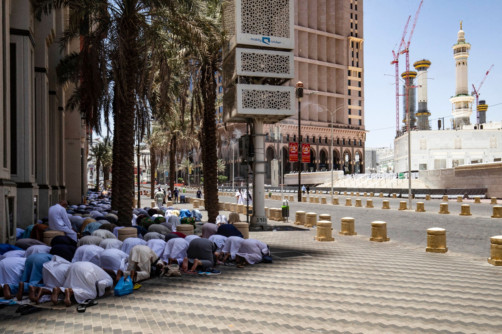 男人在沙特阿拉伯麦加的阴凉处祈祷。