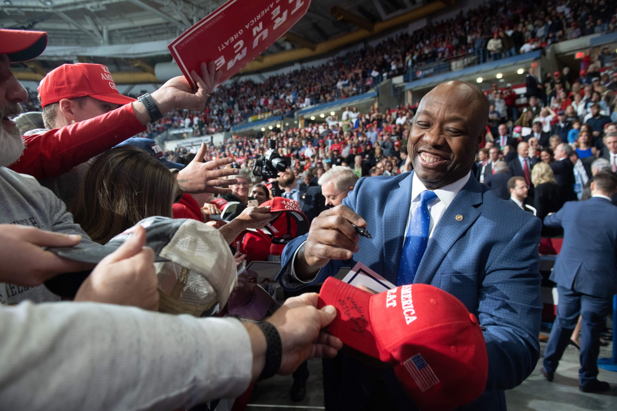 蒂姆·斯科特在2020年2月为唐纳德·特朗普的竞选集会上向支持者致意。摄影师:索尔·洛布/法新社/盖蒂图片社在访问爱荷华州和新罕布什尔州等提前投票州时,他转而专注于经济赋权,强调他帮助起草的2017年共和党减税法案中的条款,该条款为投资于欠发达“机会区”提供了巨额税收激励。
