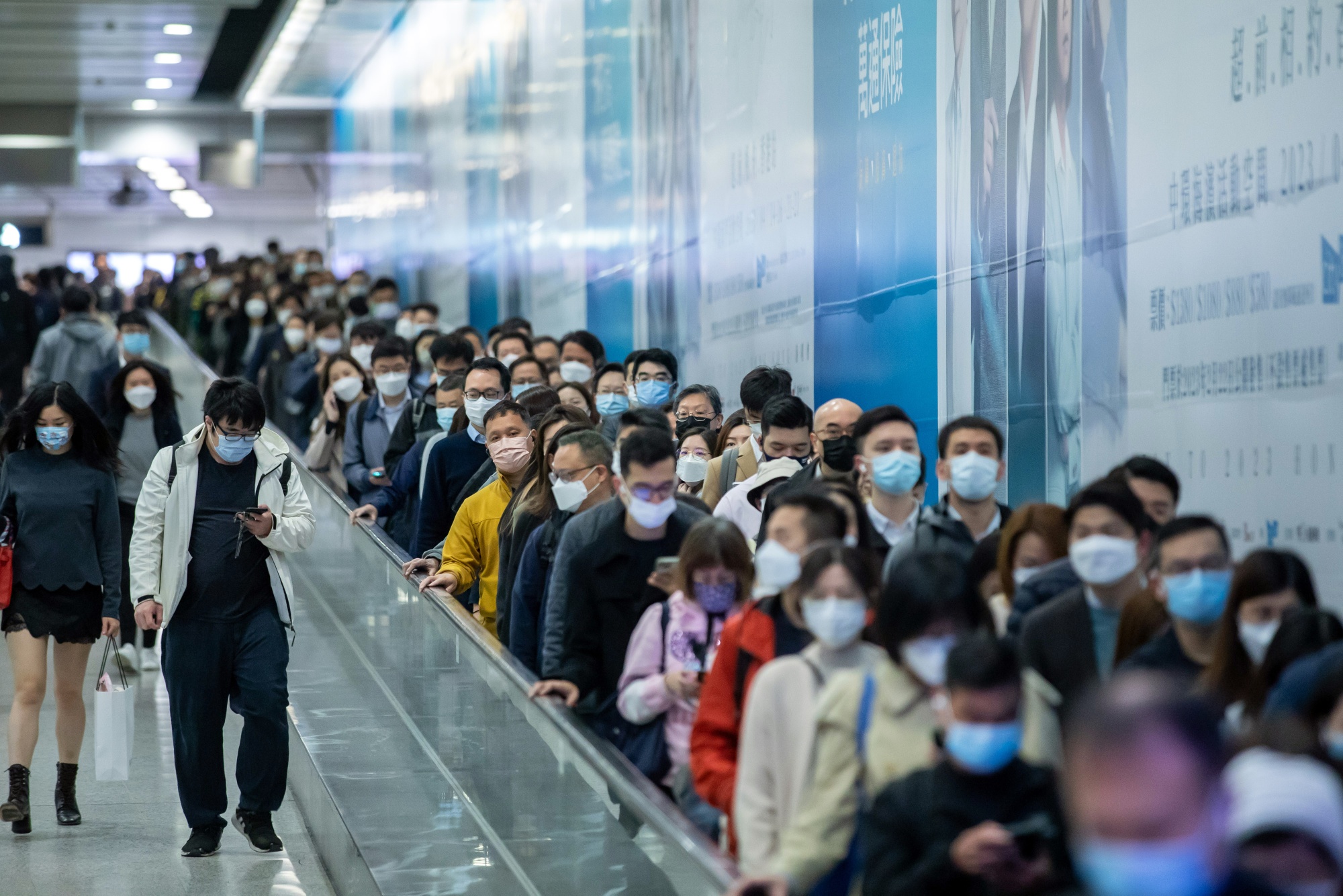 在中国香港由MTR Corp.运营的中环站的乘客,时间是2023年2月28日星期二。