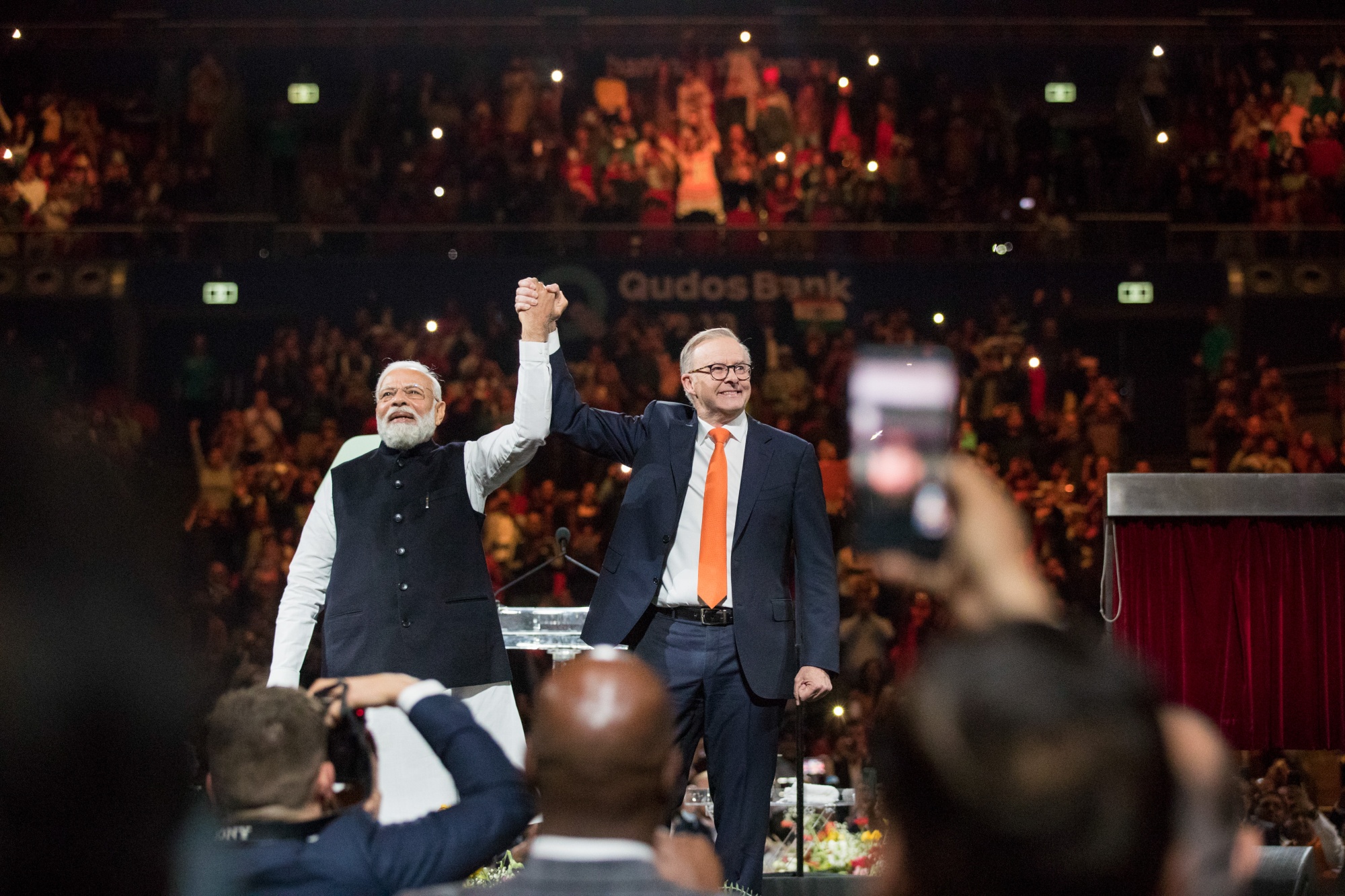 “莫迪,莫迪”的欢呼声充斥着宽敞的竞技场,印度领导人与澳大利亚总理安东尼·阿尔巴尼斯一同进入,后者表示庆祝活动与他担任总理一年的时间重合。