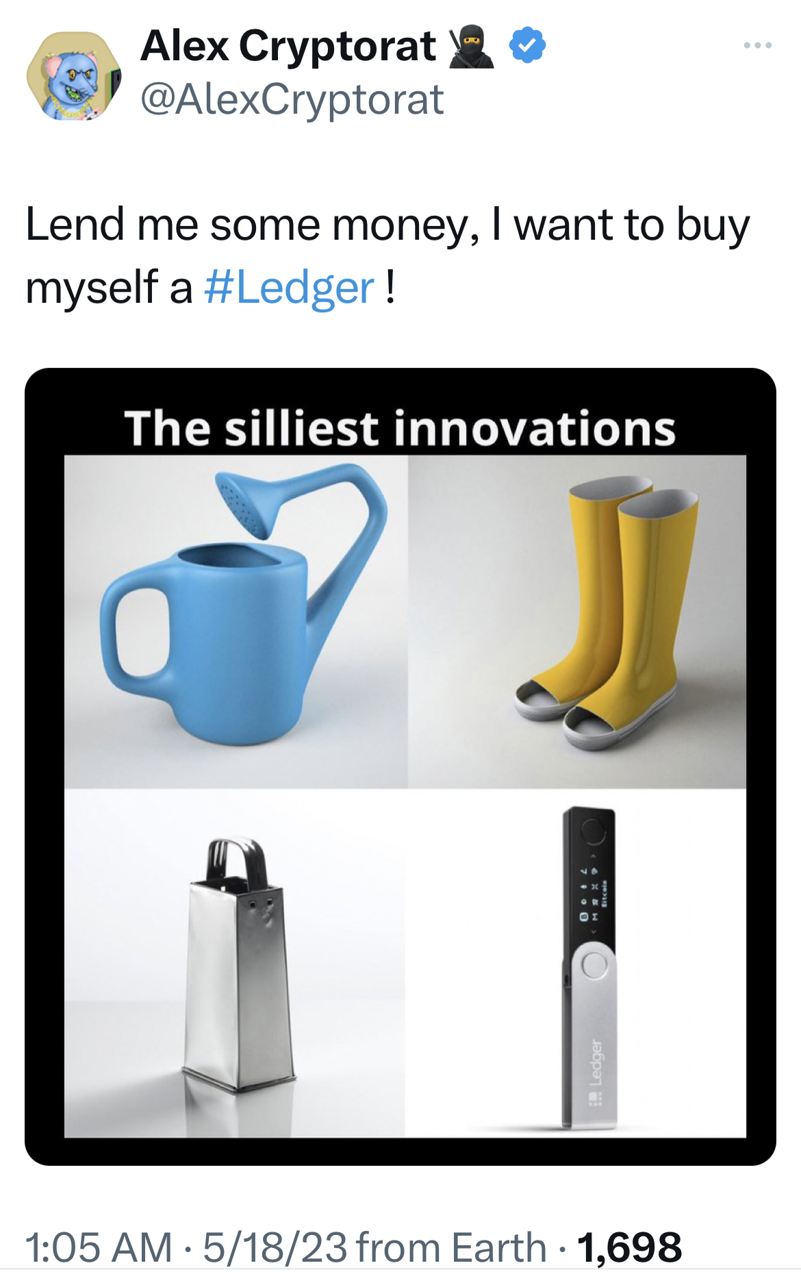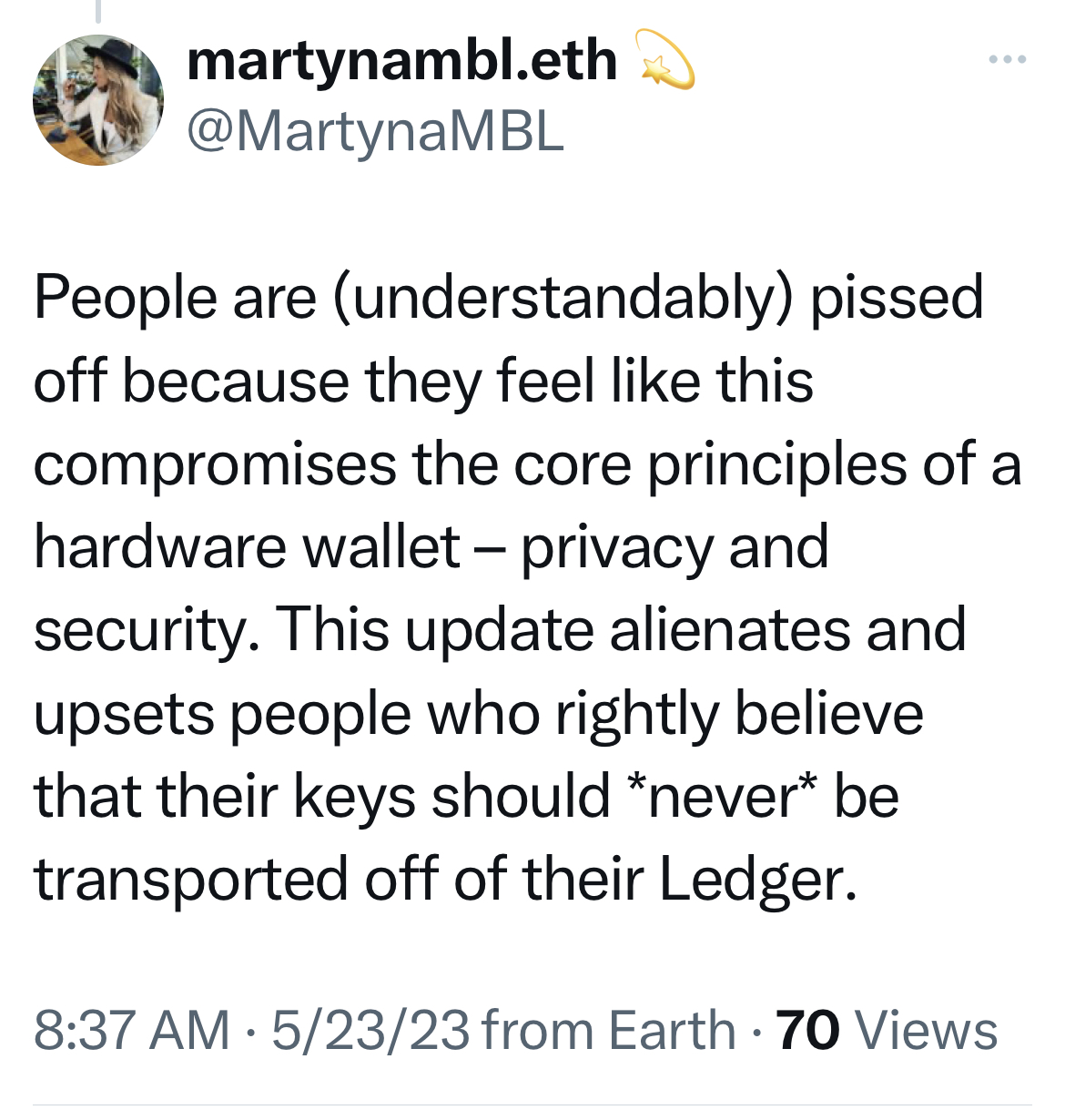来源: @MartynaMBL](https://twitter.com/MartynaMBL/status/1660988208304275460)Ledger遭受的抨击引发了行业内中心化与去中心化之间持续的紧张关系。这也提醒了在维护安全和隐私与实现对非安全专业人员友好且易于访问的用户体验之间的权衡。