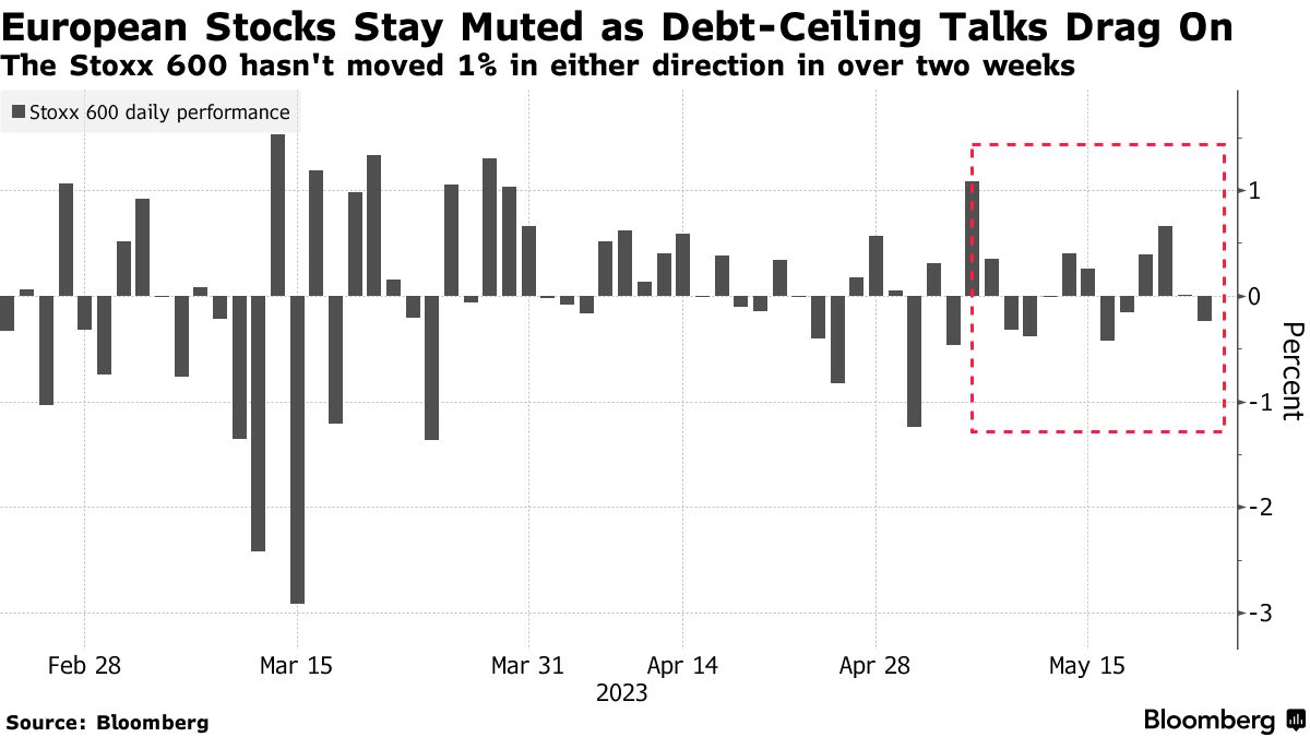 欧洲股市今年以来上涨了10%,但本月因担忧经济增长放缓和债务上限谈判未能取得进展,投资者未敢大举下注,导致涨势有所减缓。尽管 Stoxx 600 指数接近2022年2月以来的最高水平,但该指数已经连续两周多未出现1%的涨跌。