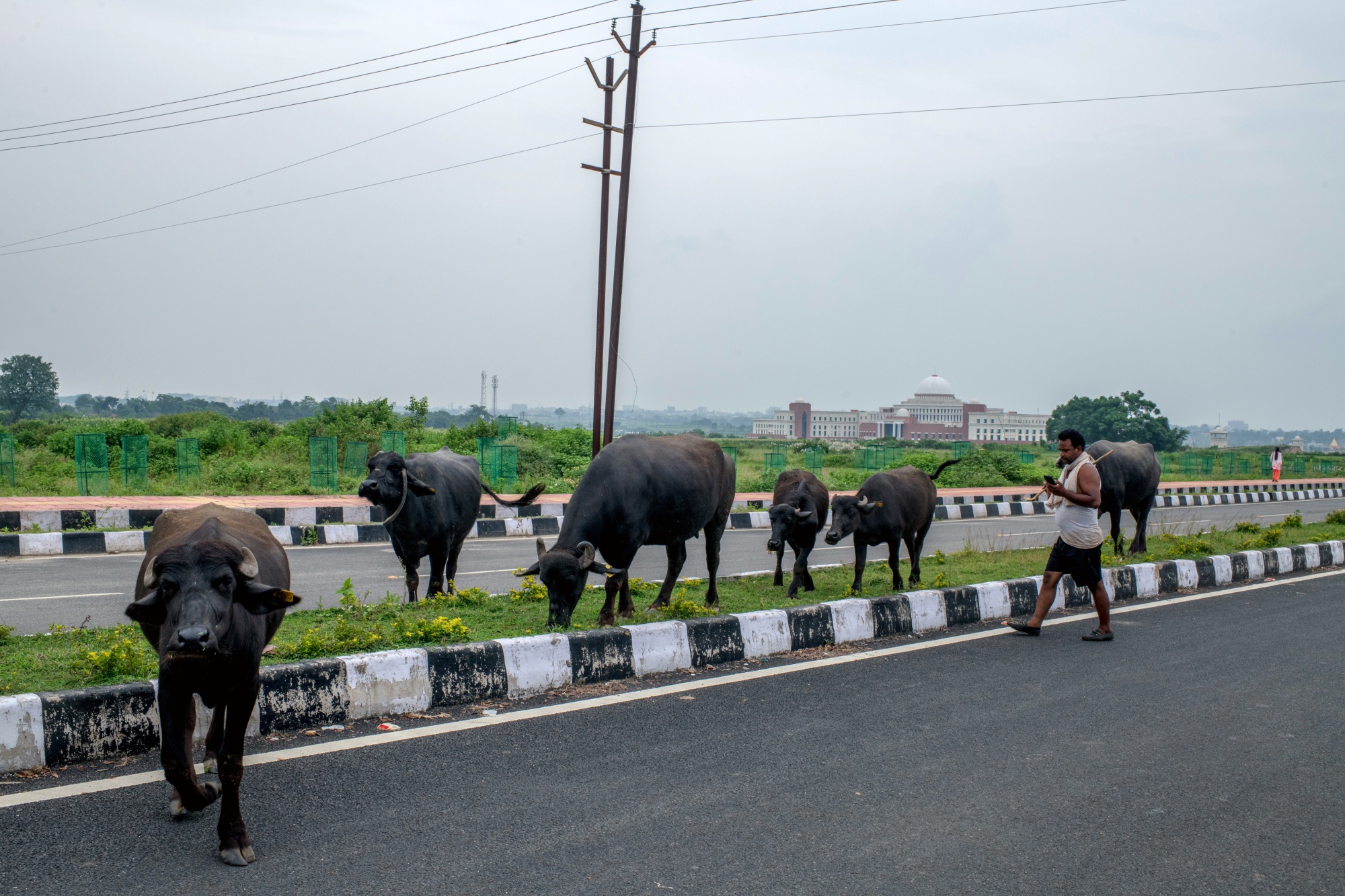 水牛在恰尔肯德拉邦议会大厦附近的公路上吃草。摄影师:阿尔科·达托/彭博社除了印度在道路设计和交通方面更常见的问题外,流浪动物可能会加剧这一威胁。截至2019年,印度有 500万 头流浪牛和1500万只流浪狗,驾驶员必须特别注意,尤其是在新德里或孟买等不太发达的城市。为了减轻这种情况,辛格建议政府为流浪动物提供安全庇护所,这些庇护所应该由地方政府管理,并得到社区团体的支持。