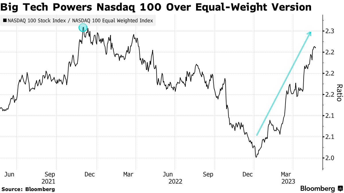 今年以来,大型科技股的表现已经超出预期,以至于纳斯达克100指数在与等权重版本的比率相比时,交易接近一年多来的最高水平。在苹果公司、微软、谷歌母公司、亚马逊、英伟达、特斯拉和Meta平台等主要股票的强劲增长支撑下,该指数截至2023年已上涨25%,而等权重版本仅上涨了12%。
