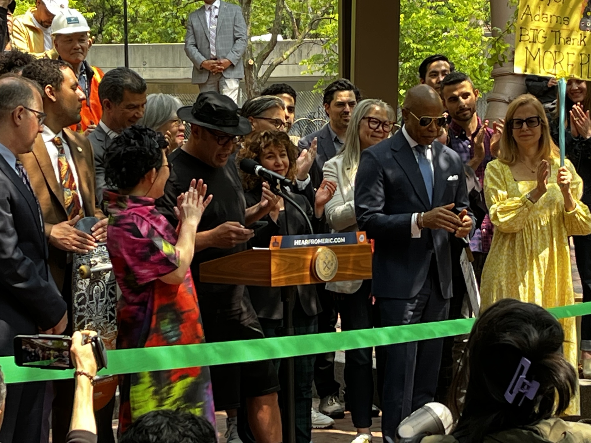 布鲁克林银行社区倡导者与市长埃里克·亚当斯在2023年5月24日“拱门”开幕式上发言。摄影师:伊曼纽尔·约翰·弥尔顿/彭博社“每个人都需要开放空间。我们在疫情期间看到了人们需要这些空间来坐下来享受与之相关的娱乐。所以这是一个令人兴奋的时刻,”亚当斯在公园开幕式的新闻发布会上说道。“我们还有更多工作要做。那些倡导者们和社区组织者,请让我们知道。我们需要找到这样的空间来创造我们都可以享受的开放空间。”