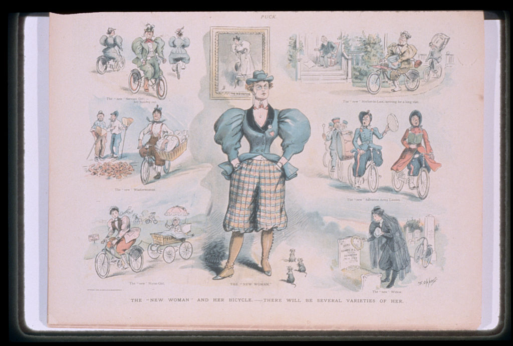 1895年对“新女性”的描绘,自行车代表了摆脱压迫的手段。由F. Opper设计,来自《Puck》。