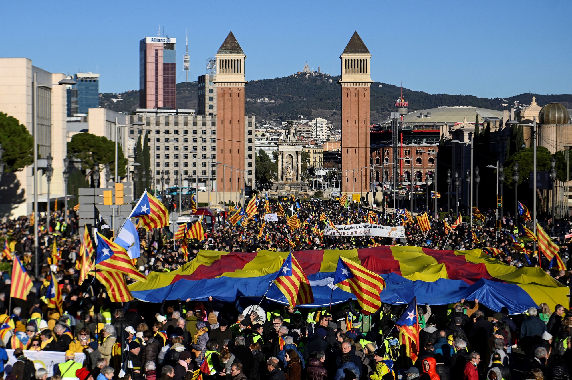 抗议者在巴塞罗那举行的法国-西班牙峰会场外挥舞着巨大的加泰罗尼亚独立“Estelada”旗帜,日期为1月19日。摄影师:Josep Lago/AFP/Gety Images2021年,桑切斯通过赦免被定罪犯有煽动叛乱罪的九名加泰罗尼亚分裂主义领导人,令对手和盟友大为震惊。那一年,社会党在加泰罗尼亚议会赢得最多席位,但未能组建地区政府。