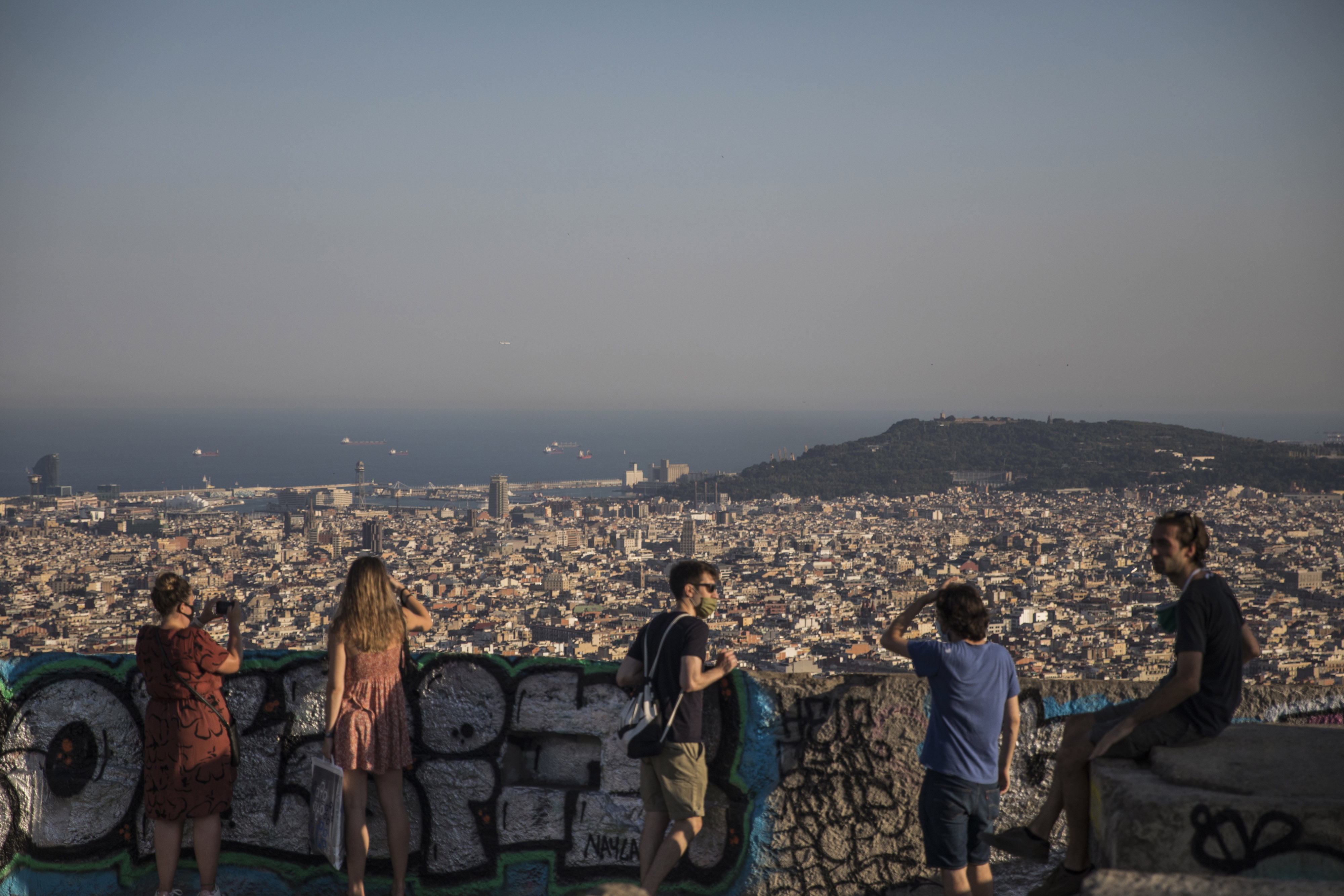 游客们从西班牙巴塞罗那的卡梅尔碉堡景点眺望城市。