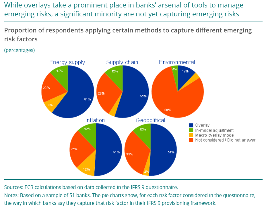 欧洲央行的一项调查发现,80%的贷款机构在应用更多方法来捕捉新类型风险时,没有考虑或未回答是否考虑环境因素。欧洲央行表示,“一小部分先锋银行”使用所谓的覆盖层进行拨备或调整相关计算。