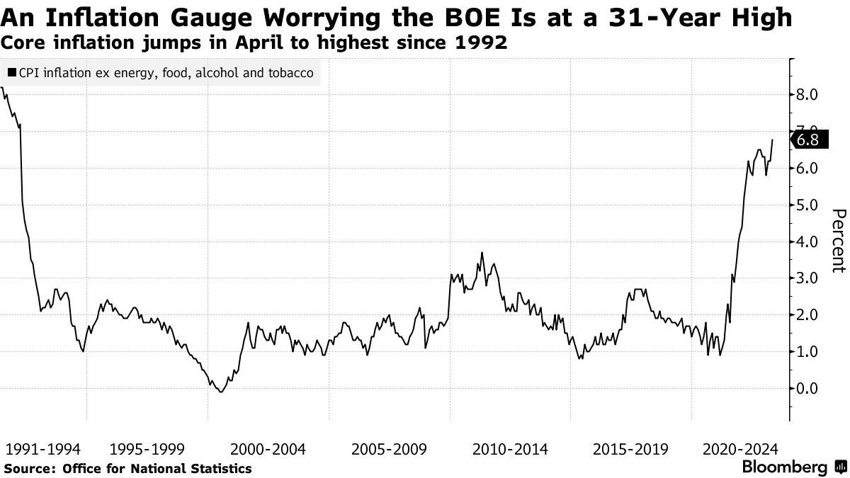 英国的通货膨胀率也以三十年来最快的速度下降,尽管本周早些时候公布的四月份数据仍高于英国央行的预测。