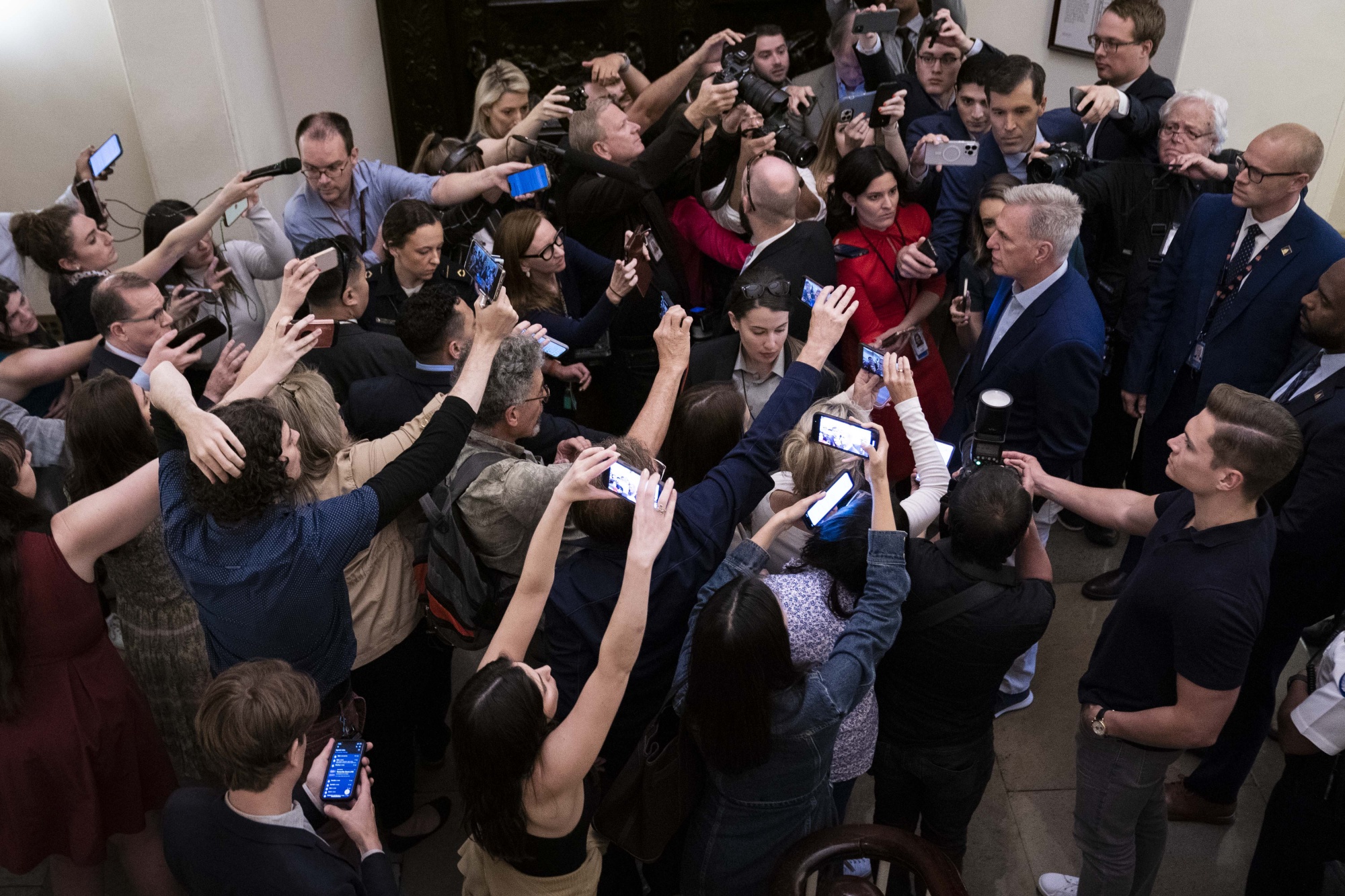 众议院议长凯文·麦卡锡今天进入国会大厦时,受到记者们的提问。