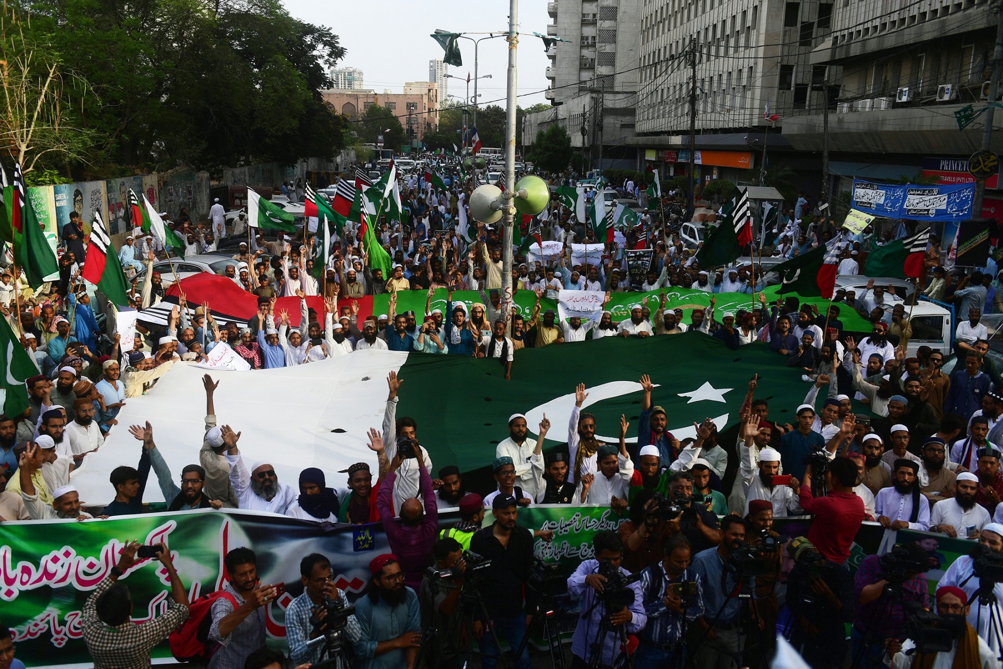 持巴基斯坦国旗的人们参加了5月19日在卡拉奇举行的支持军队的集会。摄影师:Asif Hassan/AFP/Getty Images在巴基斯坦商业中心卡拉奇这座港口城市,巨大的横幅和海报 — 有些覆盖整栋多层建筑的长度 — 宣称“巴基斯坦万岁”和“军人万岁”。其他一些特写穆尼尔和他的军官。贸易协会举行集会支持军队,而电视和电影明星则在社交媒体上表达他们对军队的爱和支持。