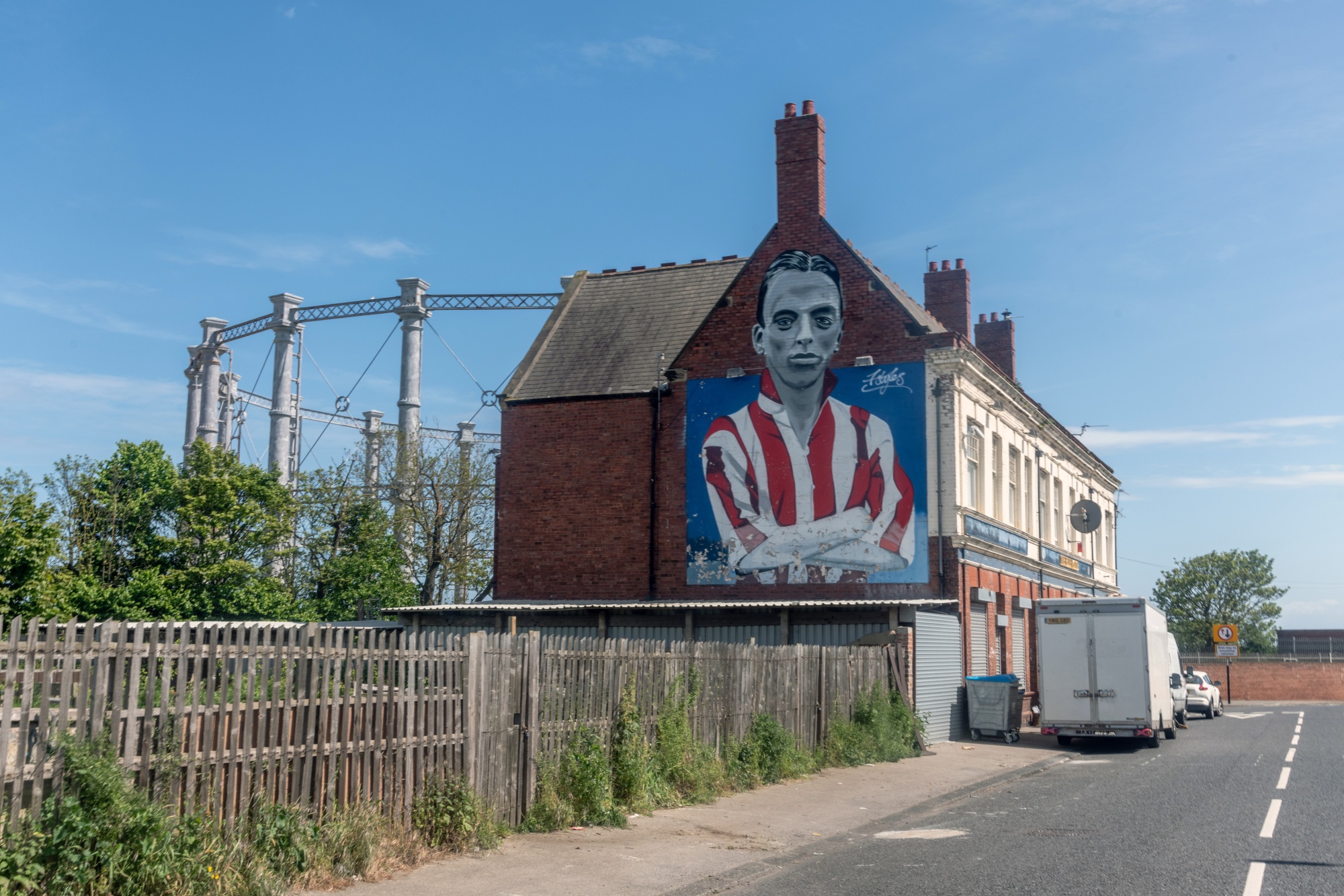 桑德兰一家酒吧外墙上的前桑德兰足球俱乐部球员莱奇·卡特尔的壁画。摄影师:乔安妮·科茨/彭博社