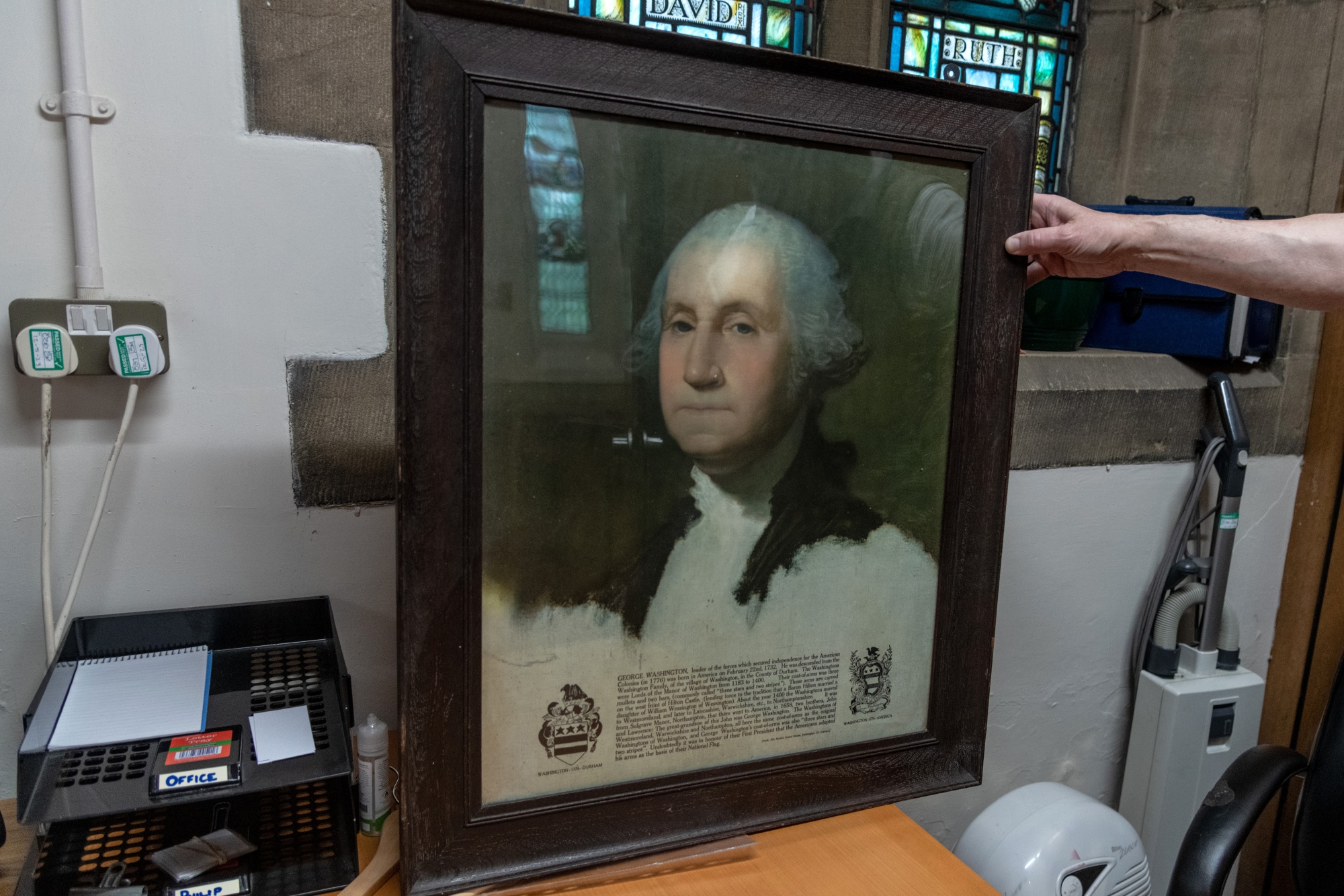 一幅由华盛顿信托公司赠送的画作,位于英格兰华盛顿的圣三一教堂,是第一位美国总统的祖居地。摄影师:Joanne Coates/彭博