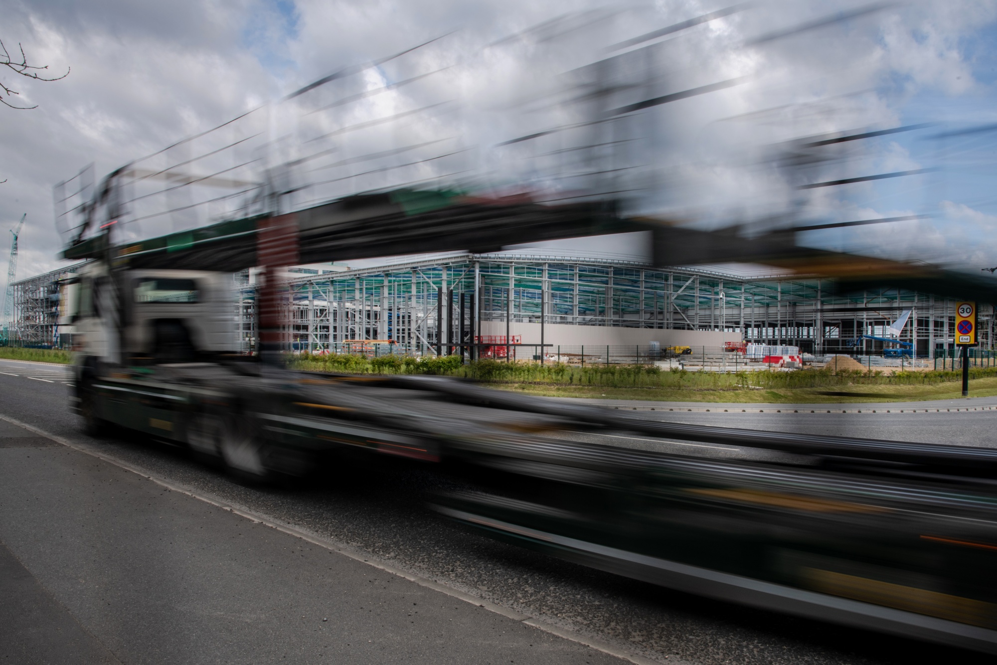 一辆空载汽车运输车经过桑德兰新尼桑超级工厂的建设工地。