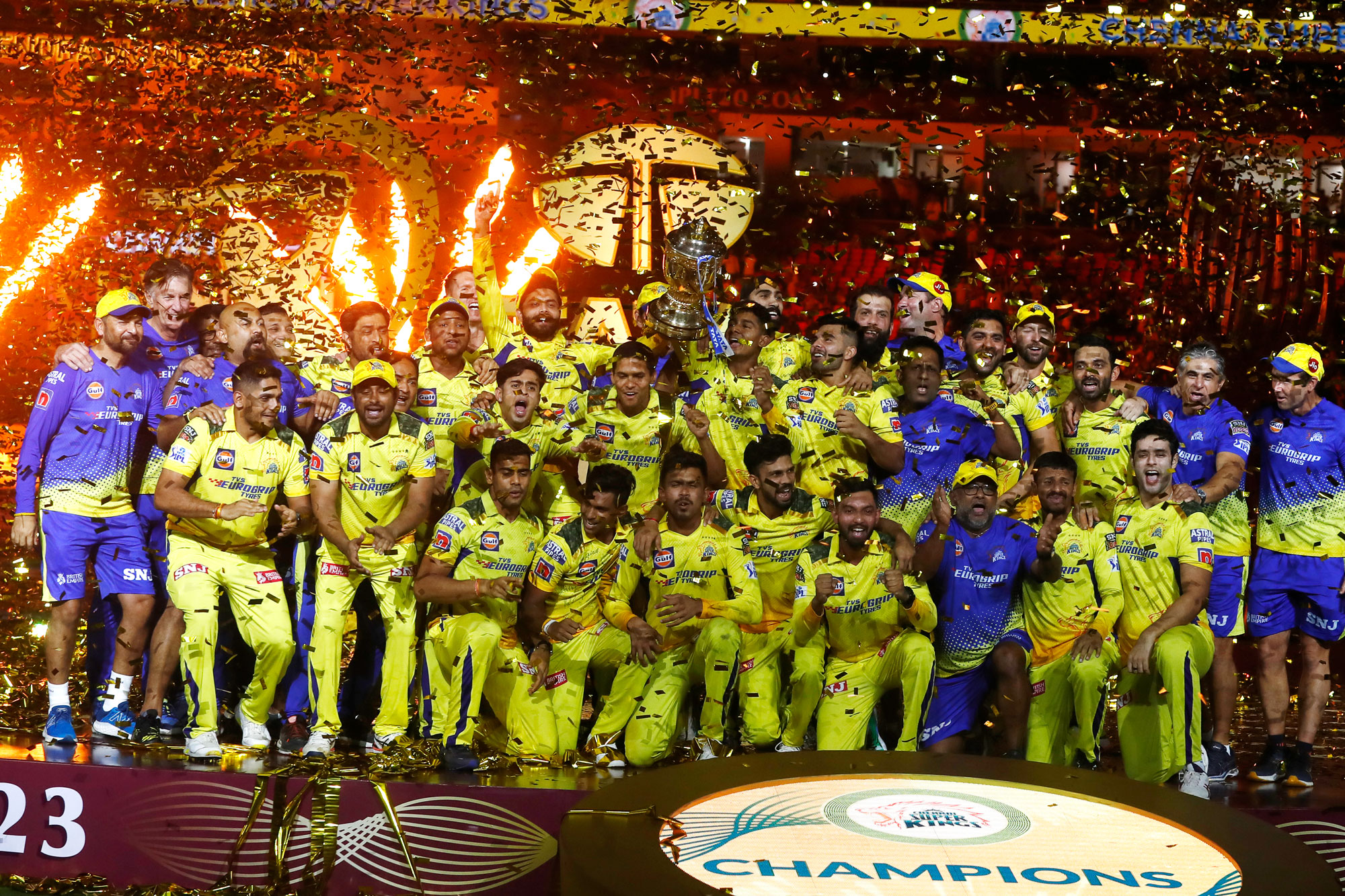 金奈超级王者庆祝在5月30日赢得IPL总决赛。
