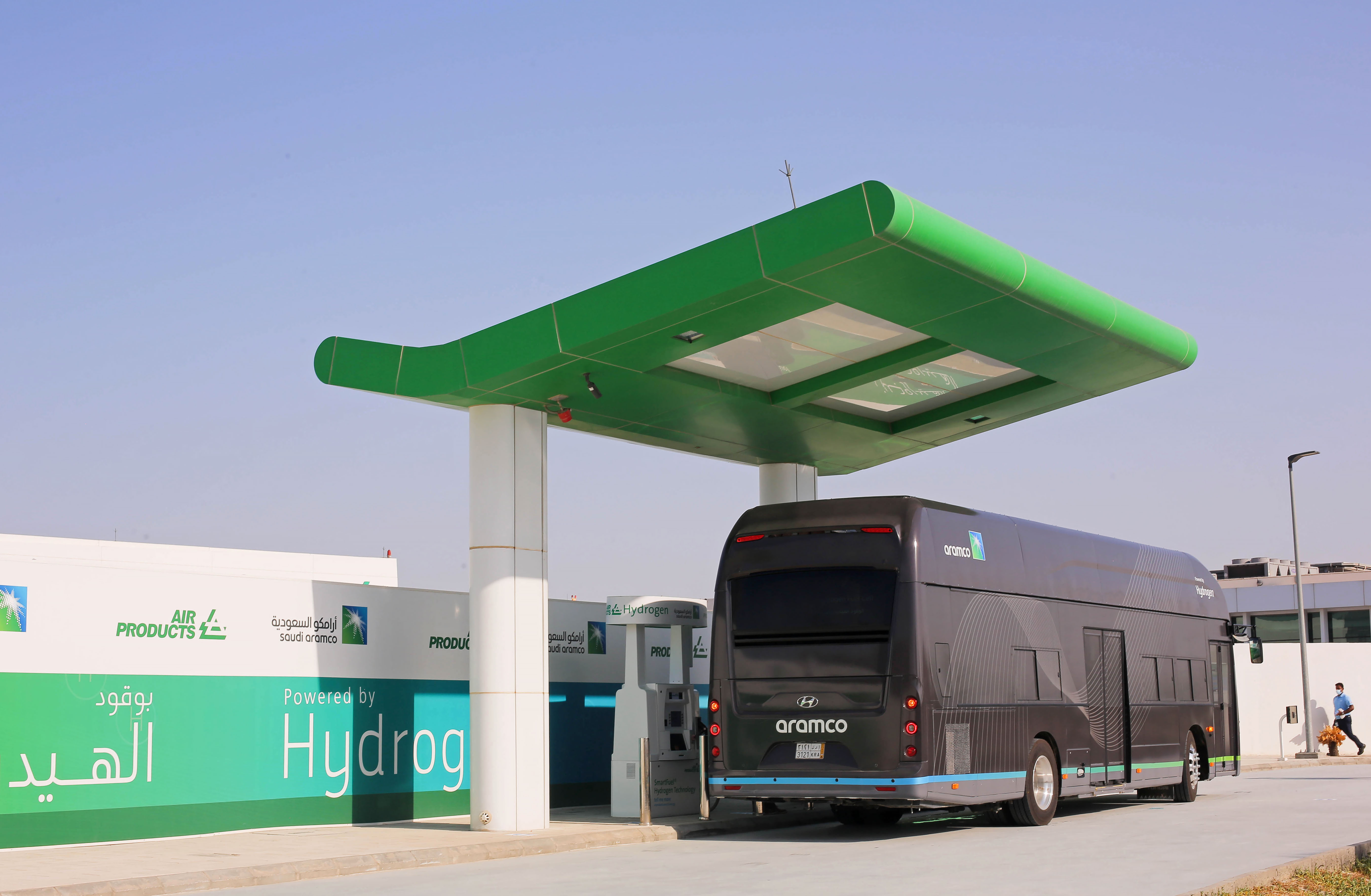 沙特阿拉伯达兰的氢燃料站内一辆氢动力公交车。