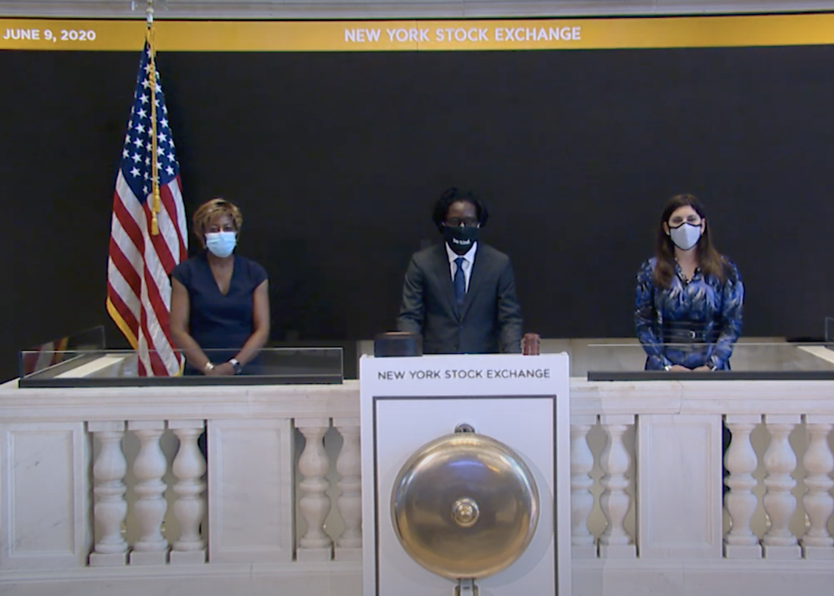 Fred Baba,中间,2020年6月敲响钟声,以纪念弗洛伊德。来源:纽约证券交易所高盛集团的一位资深利率交易员,在乔治·弗洛伊德于2020年遇害后分享了一封关于面对种族主义的感人便条,现正离开这家华尔街巨头。