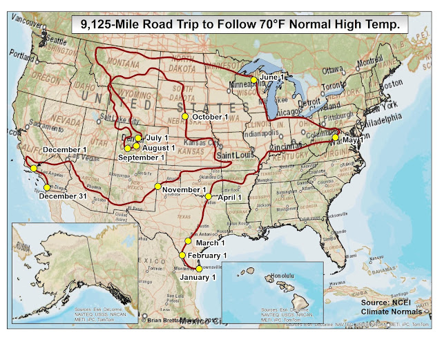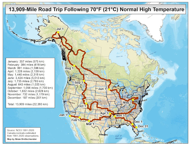 气候科学家Brian Brettschneider更新的公路旅行地图提供了多条70度天的路线。