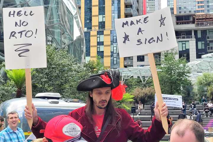 工人们聚集在铅灰色的天空下,靠近公司园区中心的植物球,手持标语牌,上面写着“不,返工!”和“倾听你的员工。停止绿色洗脑。”