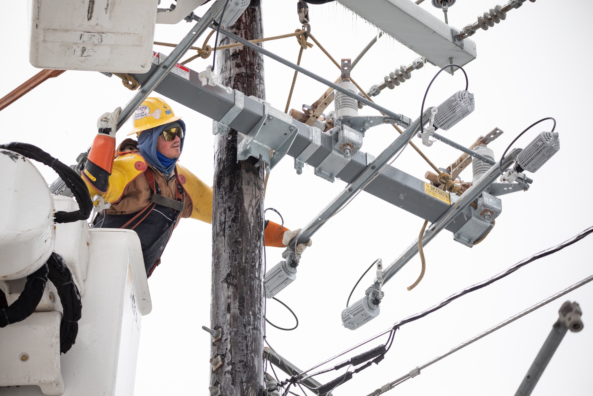 一名工人在2021年2月的冬季风暴后在奥斯汀修复电力线路。
