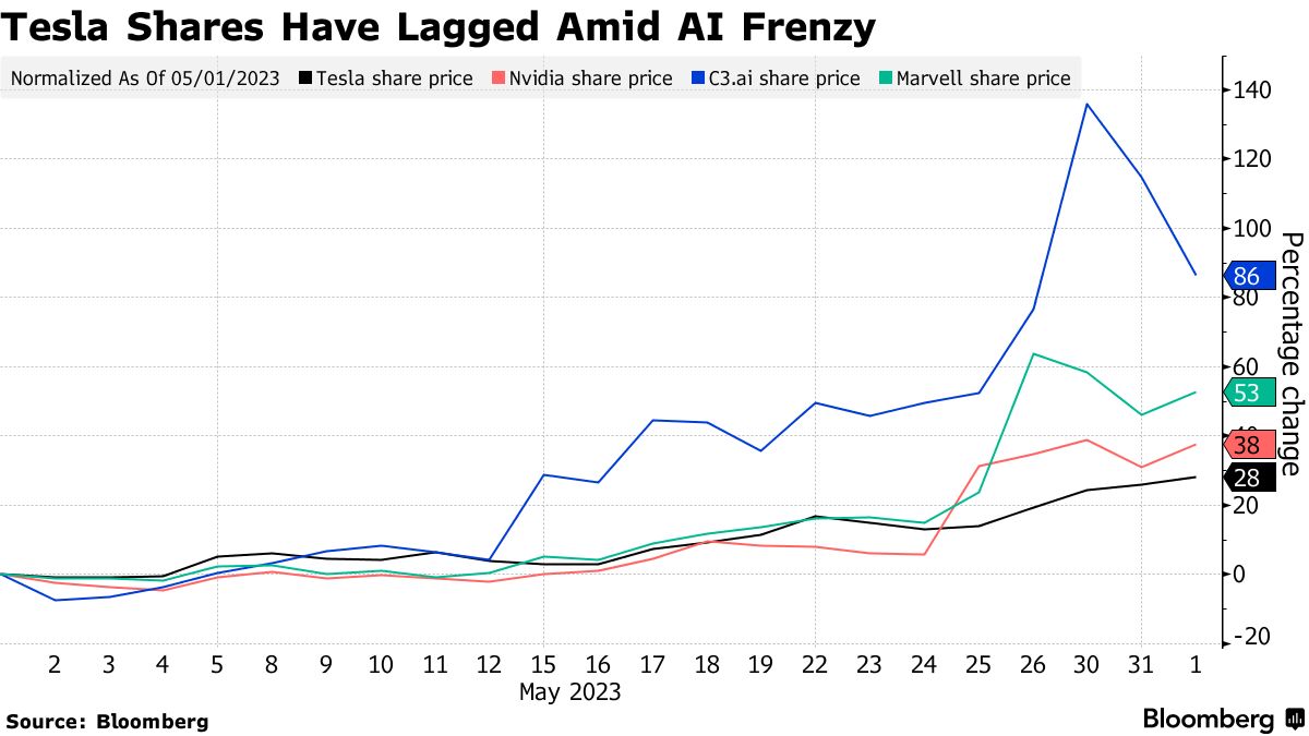 尽管如此,无论是人工智能还是否,特斯拉股票今年已大幅上涨,涨幅超过68%,超过了纳斯达克100指数的32%涨幅,甚至超过了纽约证券交易所FANG+指数的64%涨幅。然而,特斯拉股票今年的上涨是建立在2022年股价暴跌65%的基础上的,这是该股票有史以来表现最糟糕的一年。