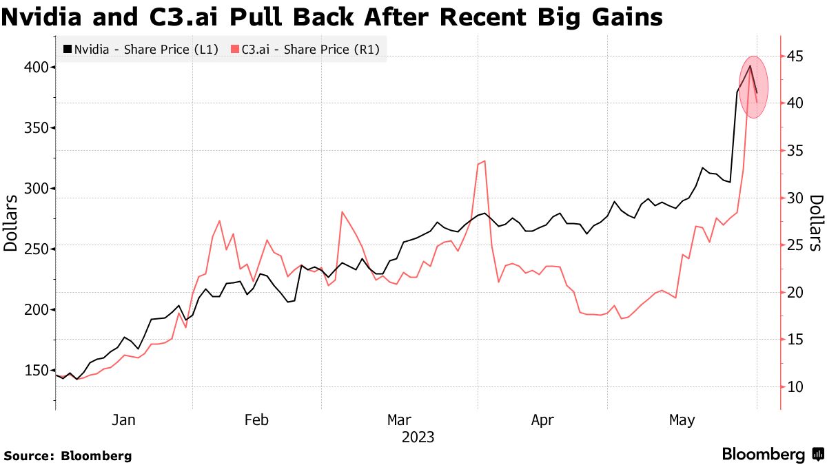 人工智能软件公司 C3.ai 周四下跌超过18%,延续了周三下跌9%的趋势,因为销售前景令人失望,今年的涨幅仅不到200%。 英伟达公司 周三下跌5.7%,此前在三天内暴涨超过30%,在本周早些时候曾一度达到1万亿美元的市值。