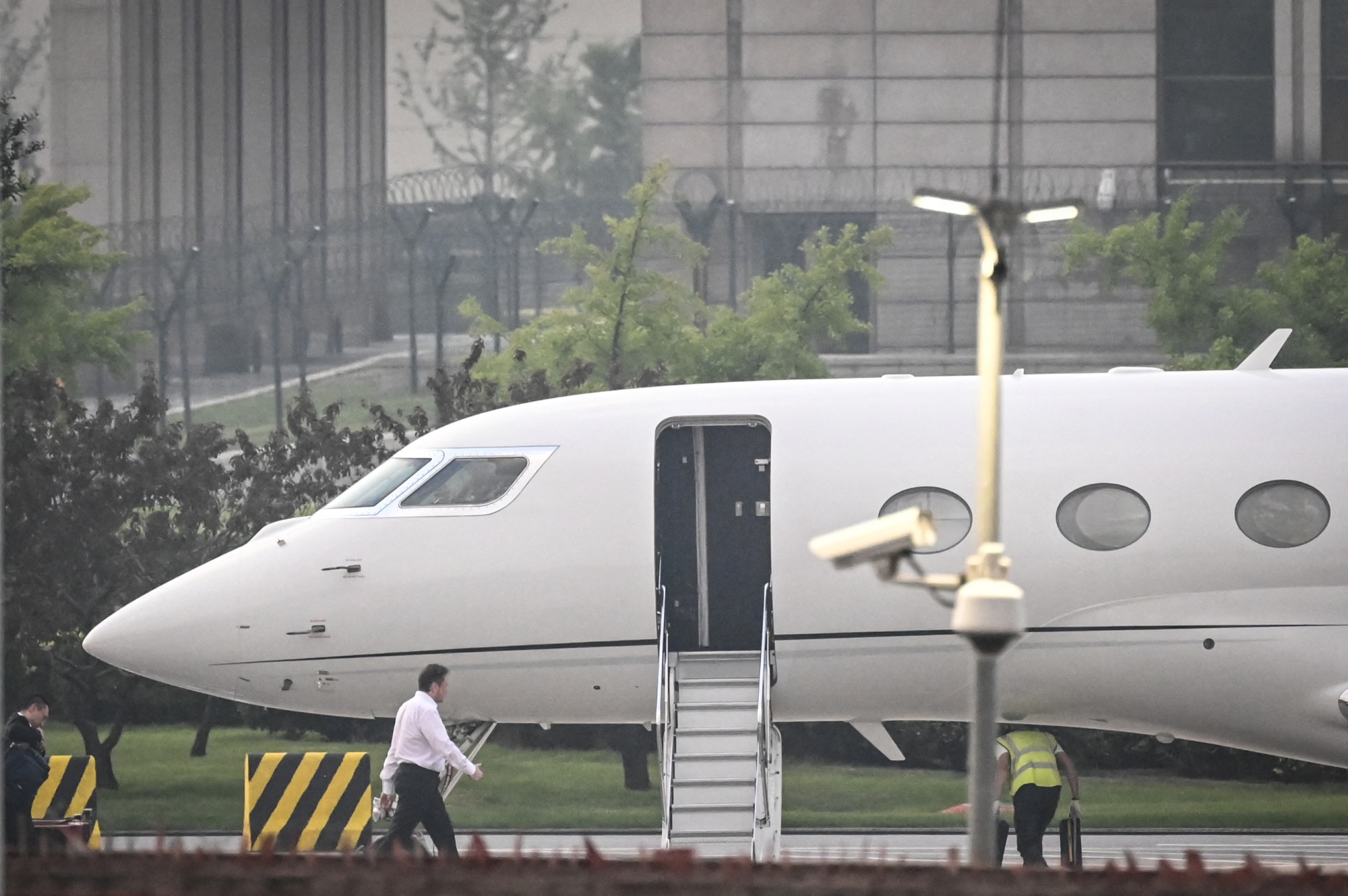 埃隆·马斯克准备登上他的私人飞机,于5月31日从北京首都国际机场出发。摄影师:Jade Gao/AFP/Getty Images周三,他会见了中国工业和信息化部部长金壮龙,并访问了商务部,与特斯拉汽车高级副总裁朱晓东和特斯拉大中华区政府及公共事务副总裁陶瑞斯一同前往。