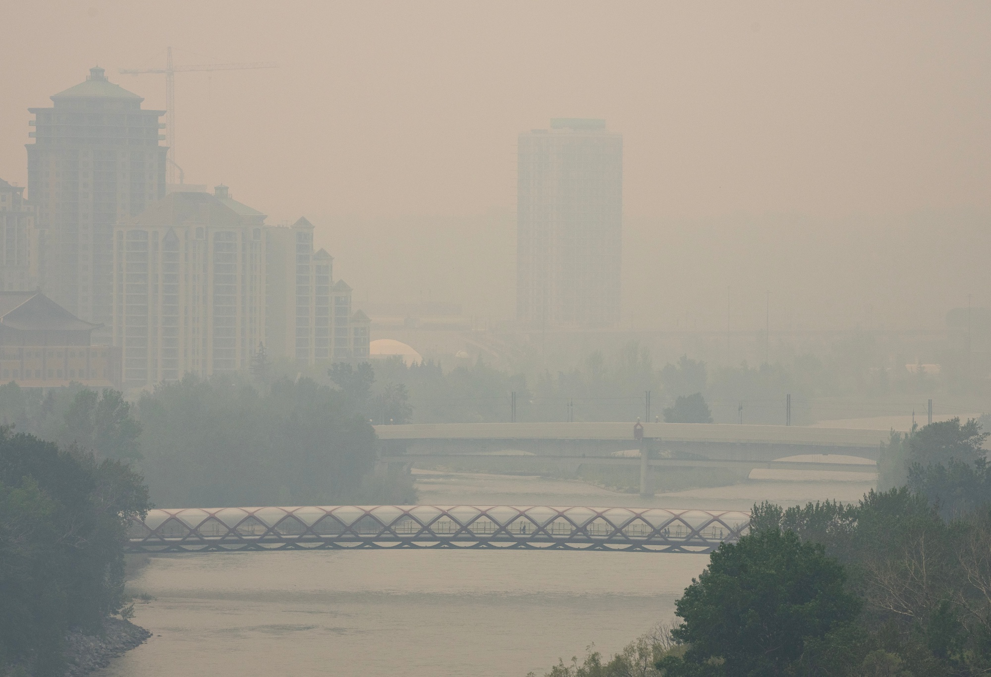 加拿大阿尔伯塔省卡尔加里市被野火笼罩的建筑,拍摄于2023年5月17日星期三。截至5月31日,加拿大今年已经发生了1,819起火灾。
