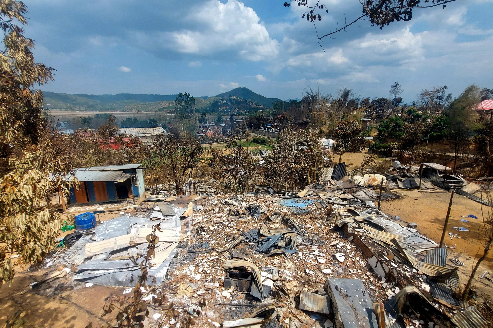 在曼尼普尔邦康波克皮村烧毁的房屋遗迹,5月31日。
