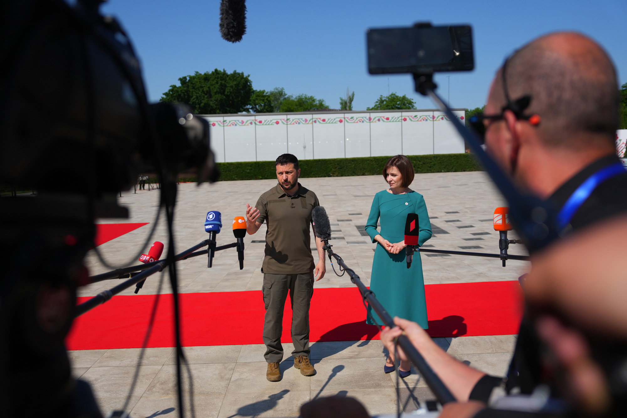 摄影师:卡尔·科特/盖蒂图片社乌克兰总统弗拉基米尔·泽连斯基在邻国摩尔多瓦举行的峰会上意外露面,当天俄罗斯向基辅投放更多导弹。