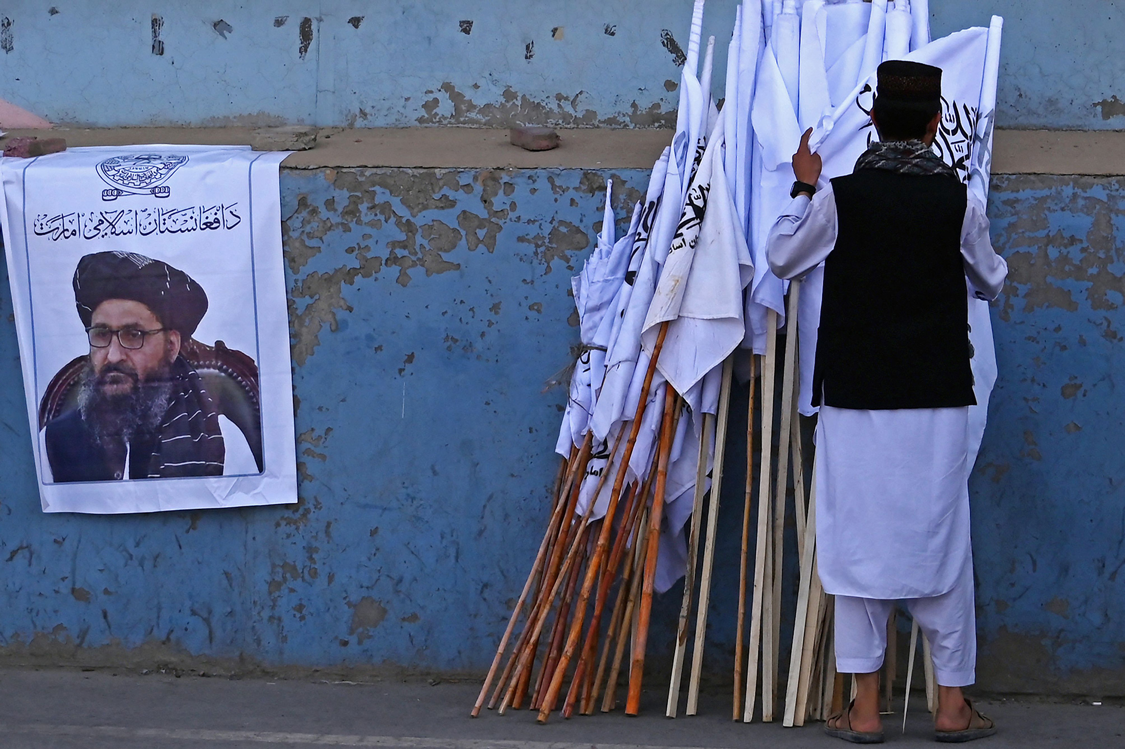 塔利班旗帜在喀布尔街头与阿卜杜勒·加尼·巴拉达的海报旁出售。摄影师:Aamri Qureshi/AFP/Getty Images亚库布一直公开领导与印度建立关系的努力,包括敦促印度政府培训塔利班部队。