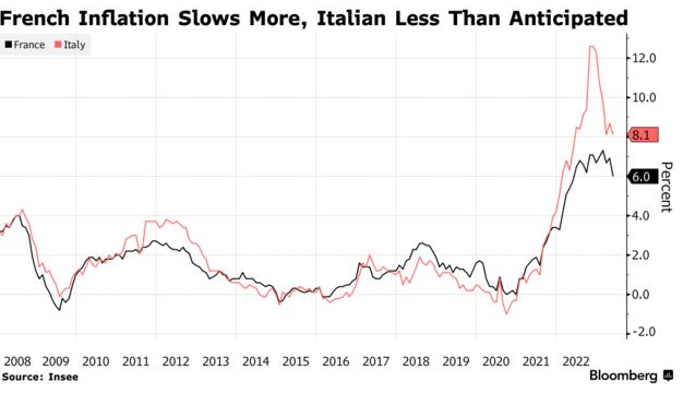 法国通胀率降至一年来的最低水平,德国的通胀率下降幅度超过预期,尽管意大利的通胀率超过分析师的预期,突显了欧洲央行在接近其前所未有的加息行动结束时面临的挑战。货币市场交易员削减了利率赌注,不再完全定价今年再次上调50个基点的加息。尽管欧洲央行对总体通胀率的回落表示欢迎,但意大利高于预期的数据以及除能源和食品成本之外核心价格压力仍然居高不下的迹象意味着决策者不能放松警惕。