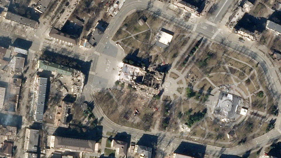 来自Planet Labs的一张图像显示了2022年5月马里乌波尔剧院的破坏。来源:Planet Labs PBC乌克兰国防部未回复置评请求。