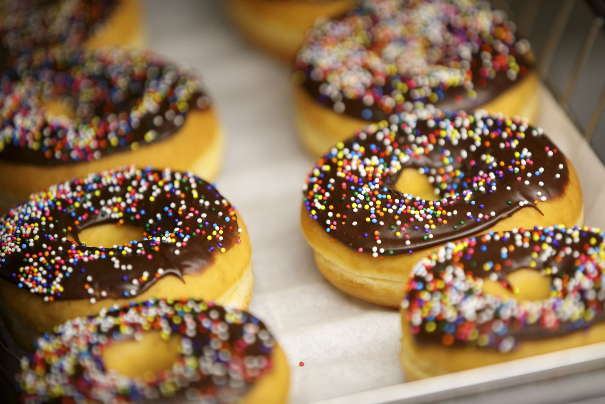 一盘撒有糖霜和彩糖的巧克力甜甜圈摆放在售卖区。