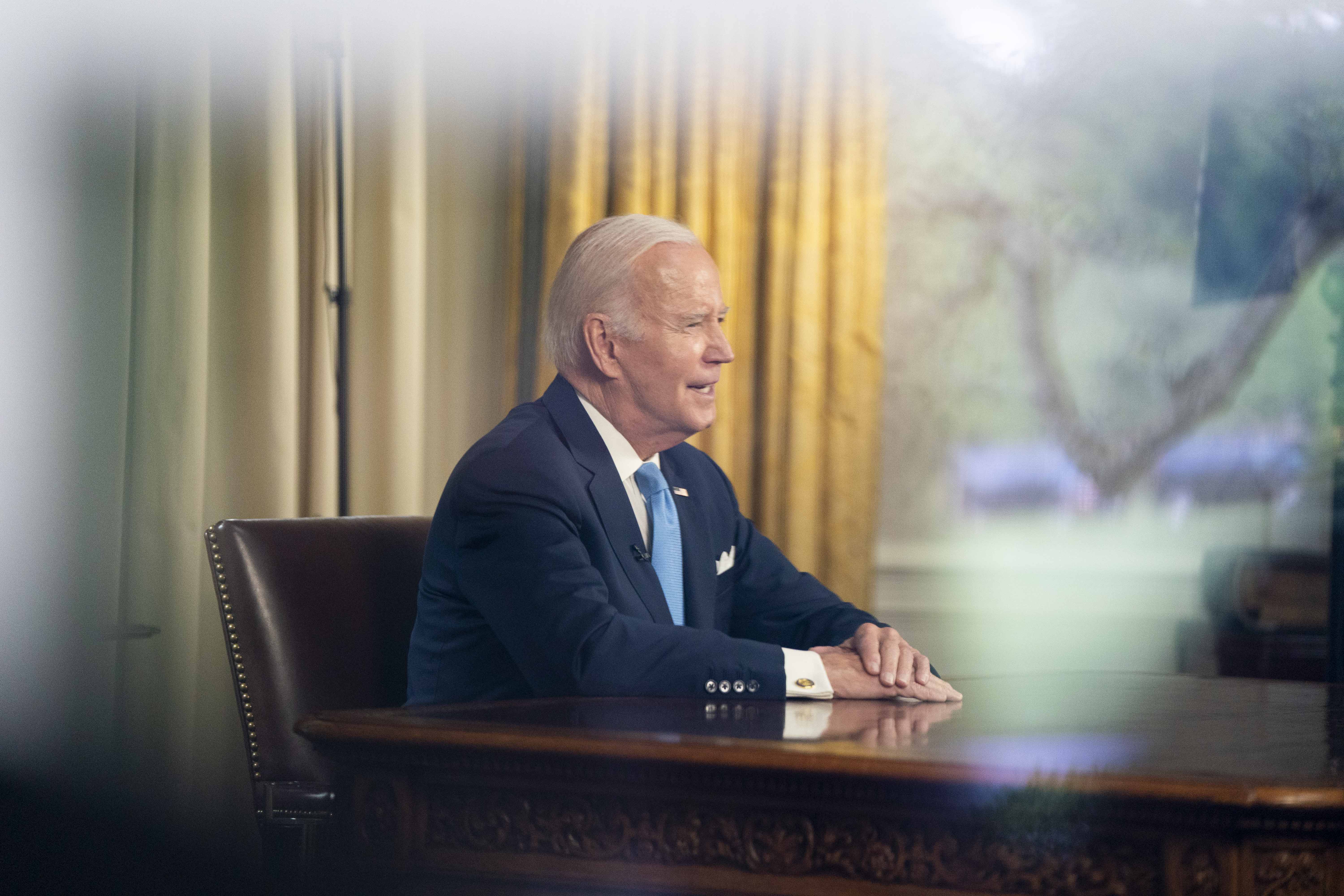 乔·拜登总统在华盛顿特区白宫椭圆形办公室发表全国讲话,时间为6月2日。