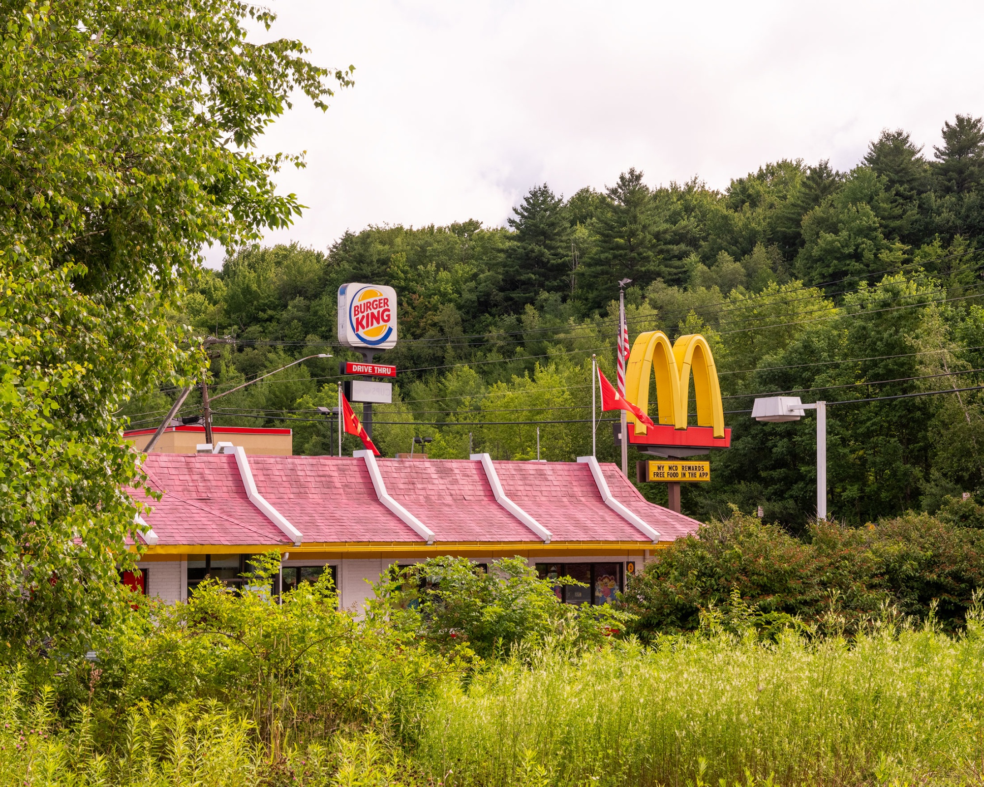 **在纽约卡茨基尔山脉,就在17号州道旁边,**有一个大门,两侧是图腾柱。远处是起伏的绿色小山丘,破旧的小屋,一排电话亭,以及一个关于这里曾经经营的夏令营的线索:一个餐厅标志柱上讽刺性地贴着麦当劳的金拱门。