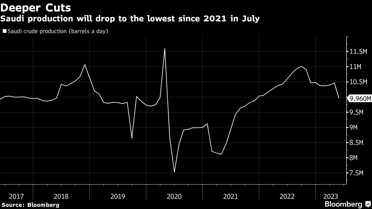 周末的OPEC+会议以沙特阿拉伯承诺在7月额外减产100万桶/日结束,而其他成员仅延长其现有的减产政策12个月。