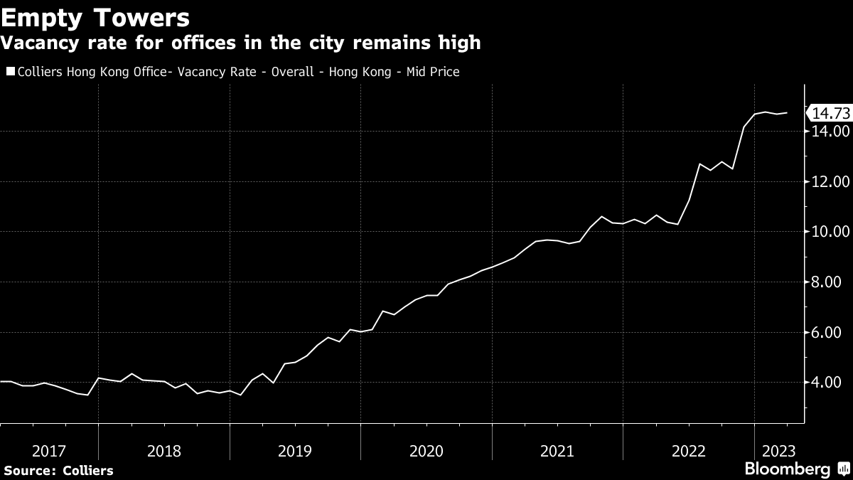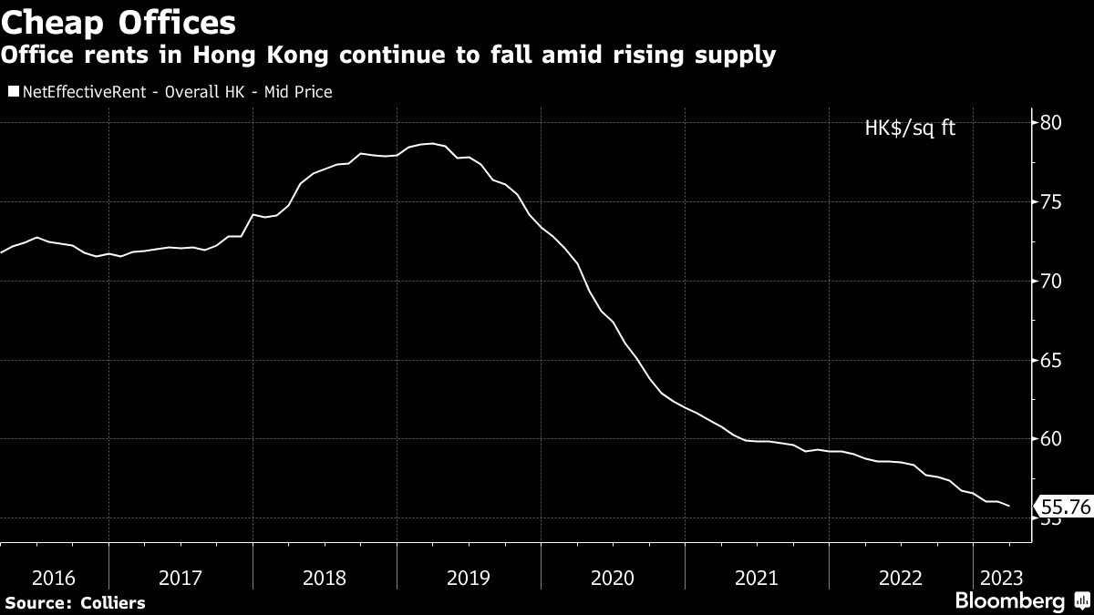 随着交易放缓和中国加强对这个金融中心的控制,西方银行一直在缩减空间。预计会填补空缺的中国公司并没有像预期的那样大量吞噬空间,因为他们自己的经济陷入困境。一系列新建筑物将加剧供应过剩。