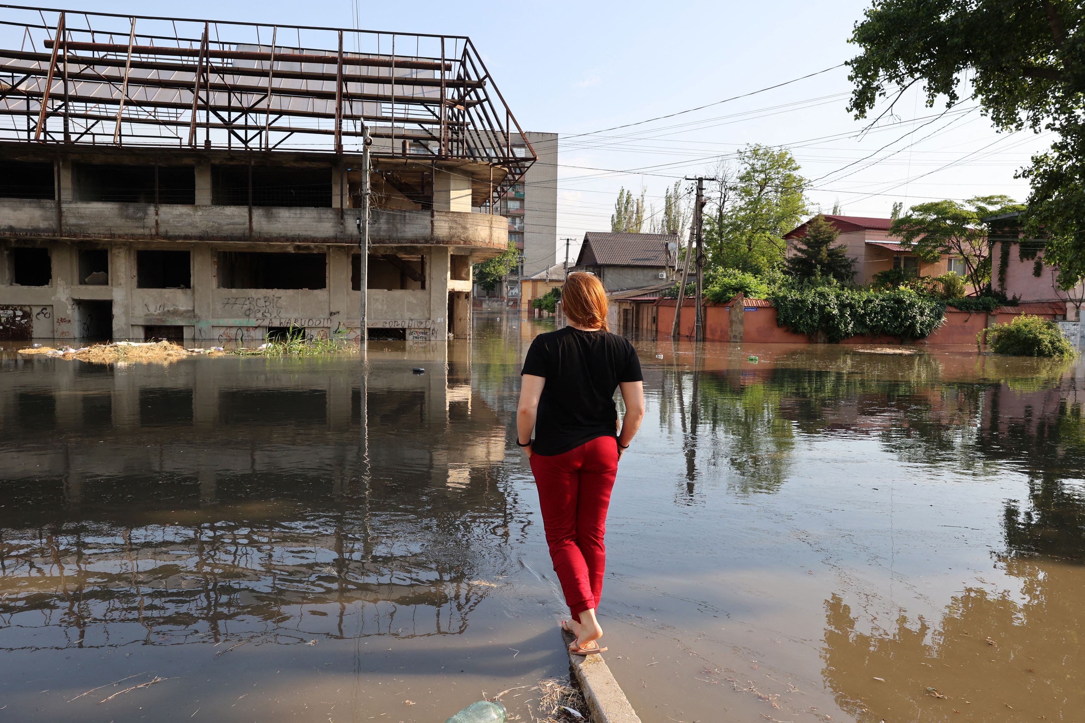 一名妇女在赫尔松一条被洪水淹没的街道上看着,这是在6月6日卡霍夫卡大坝爆炸后的情景。