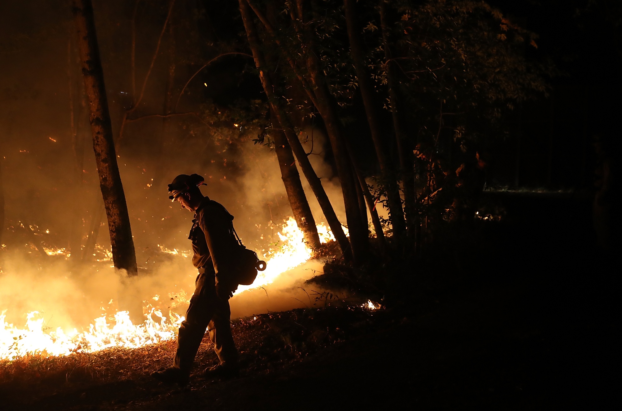 一名加利福尼亚消防员在2017年10月的卡利斯托加附近的塔布斯大火中使用滴火炬。