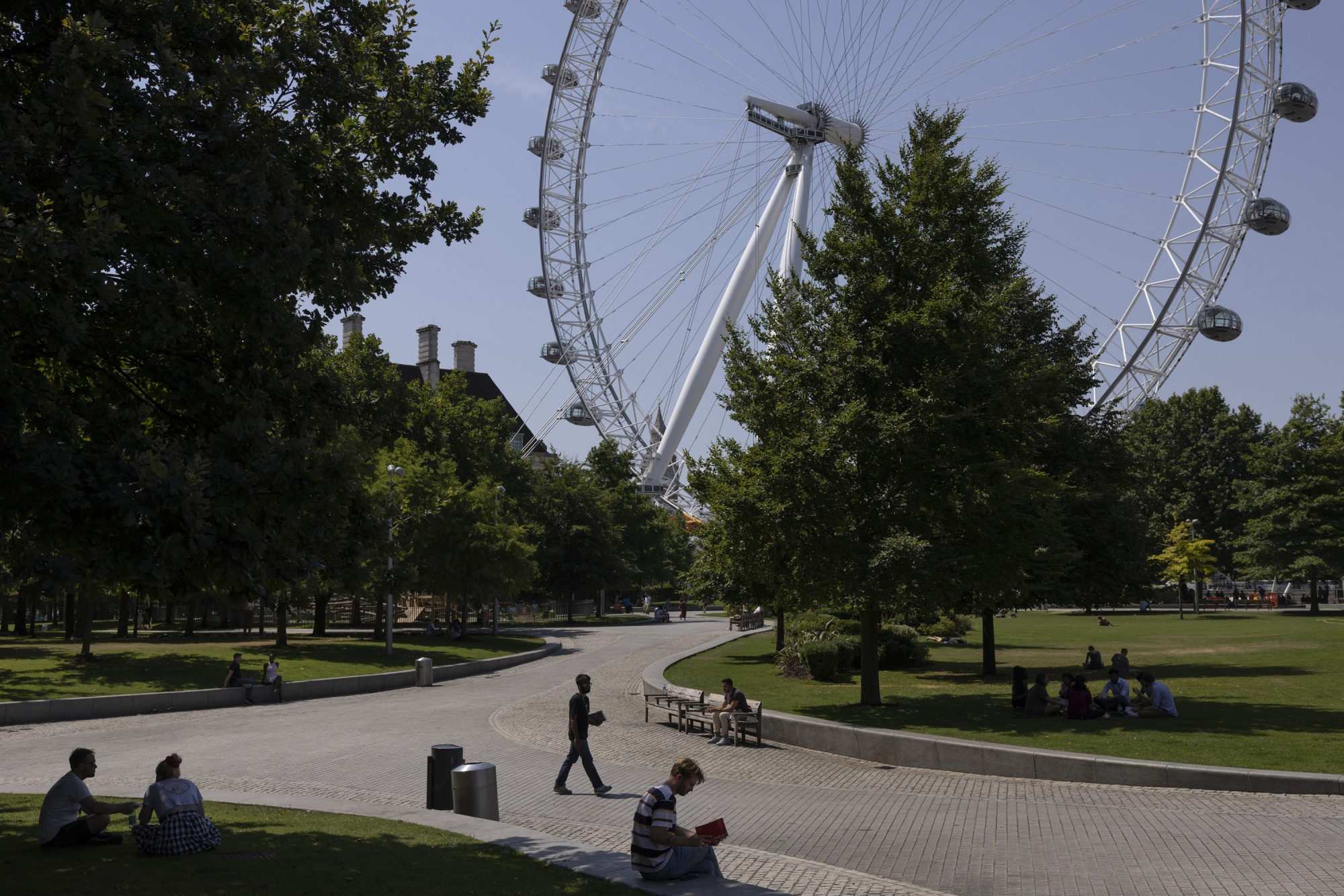 人们坐在伦敦眼附近的阴凉处。