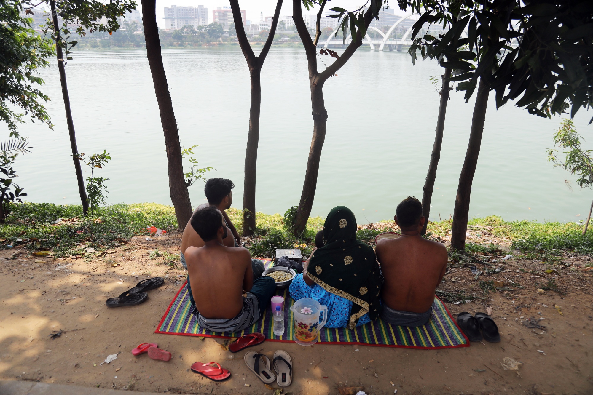 在2023年6月6日星期二,孟加拉国达卡气温高,人们坐在湖边。燃烧化石燃料释放的二氧化碳正在困住大气中的热量。这导致地球变暖,是更极端天气事件的主要推动因素,包括热浪。