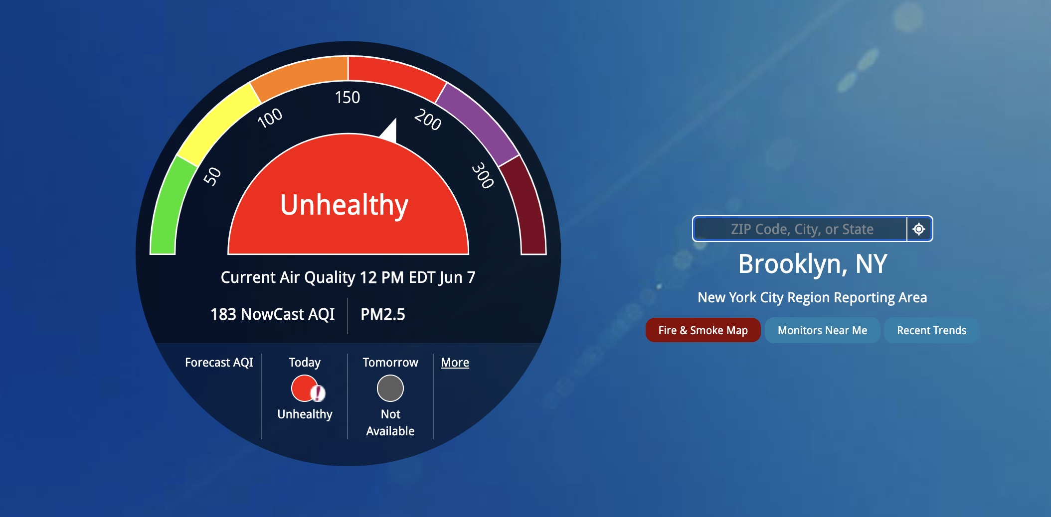 根据EPA的说法,AQI在0到50之间被认为是“良好”的空气质量标准。一旦达到101,空气质量开始被认为对敏感人群有害;到了151,对每个人都有害。在201到300之间 — 纽约市在6月6日达到的范围 — EPA警告称空气被认为“非常有害”可供呼吸。超过300,纽约市在6月7日达到的范围,就属于危险范畴。