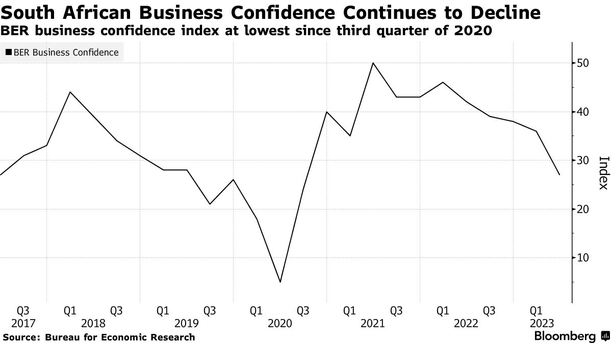 由FirstRand Ltd.的Rand Merchant Bank部门和Stellenbosch大学经济研究局编制的季度商业信心指数从上一季度的36下降到了6月份的27。这是自2020年第三季度以来的最低水平,当时高管们担心南非从新冠肺炎封锁造成的破坏中恢复的脆弱性。